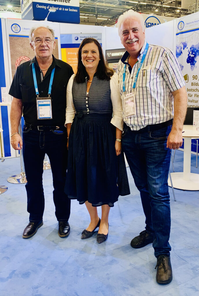 Ein Messehighlight und eine Erfolgsgeschichte: Bei der IFFA 2019 besuchte die Metzgerfamilie Rinner aus Graz den Stand der 1.BFS und informierte sich fu?r Tochter Melanie u?ber die Mo?glichkeit eines Meisterkurses –, nun wurde ihr in Begleitung ihres Papas Helmut der Meisterpreis der Bayerischen Staatsregierung u?berreicht. Die heute 24-Ja?hrige hatte ihren Meisterkurs 2021 und als eine der 20 % Besten des Jahres im Freistaat abgeschlossen. Bereits weit u?ber 100 Meister, Fleischsommeliers etc. aus O?sterreich haben Kurse an der 1. BFS besucht. Am Messestand hieß man jetzt u. a. die Su?dtiroler Familie Kofler willkommen, bei einem Messestammtisch mit u?ber 30 Ehemaligen in einer A?ppelwoi-Wirtschaft u. a. Dominik Angelmayr (26) aus Altenburg, Absolvent im Jahr 2021. Die fachliche Expertise der Ausbilder an der 1. BFS stellte in Frankfurt Prof. DI Manfred Winkler aus Hadersdorf (NO?) unter Beweis: Der Sensorik-Dozent und Oenologe war als Juror bei den Qualita?tswettbewerben des deutschen Fleischerverbands aktiv, um Wu?rstchen und Konservenware zu bewerten.