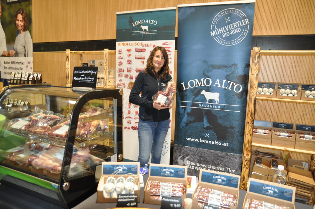 Fleisch und Spezialitäten von alten Kühen bietet Lomo Alto aus dem Mühlviertel an. Katharina Sageder informierte über das Angebot. © HaRo