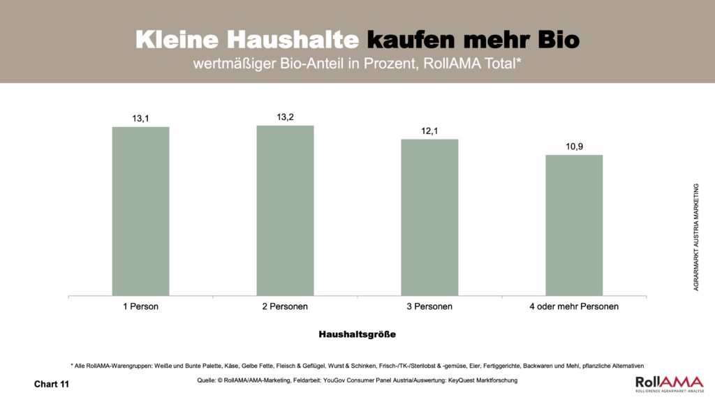 Sowohl ältere Konsumentinnen und Konsumenten ab 50 Jahren als auch junge Erwachsene bis 29 Jahren greifen überdurchschnittlich häufig zu Bio. Während Ältere besonderen Wert darauf legen, sich mit hoher Qualität von Lebensmitteln fit zu halten, stehen bei jüngeren Konsumentinnen und Konsumenten die bei Bio-Lebensmitteln verankerten Aspekte Nachhaltigkeit und Tierwohl im Fokus (Chart 10). Kleine Haushalte mit ein bis zwei Personen bevorzugen Bio ebenfalls stärker als große Familien, bei denen der Preis aufgrund der gekauften Mengen an Lebensmitteln häufig eine größere Rolle spielt – insbesondere bei teureren Produktgruppen wie Fleisch (Chart 11).