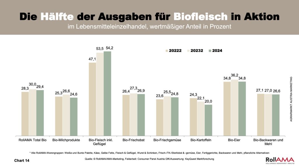 Obwohl auch Bio-Produkte stark in Aktionen beworben werden, ist der Aktionsanteil im Jahr 2024 etwas gesunken: 29,4 % der verkauften Bio-Produkte wurden im Rahmen von Preisnachlässen erworben (2023: 30,0 %) Chart 13). Eine Ausnahme bildet Bio-Fleisch: Hier bleibt der Aktionsanteil hoch, da der Preisunterschied zu konventionellem Fleisch größer ist und Preisnachlässe dazu beitragen, die Kaufentscheidung zugunsten von Bio zu erleichtern (Chart 14).
