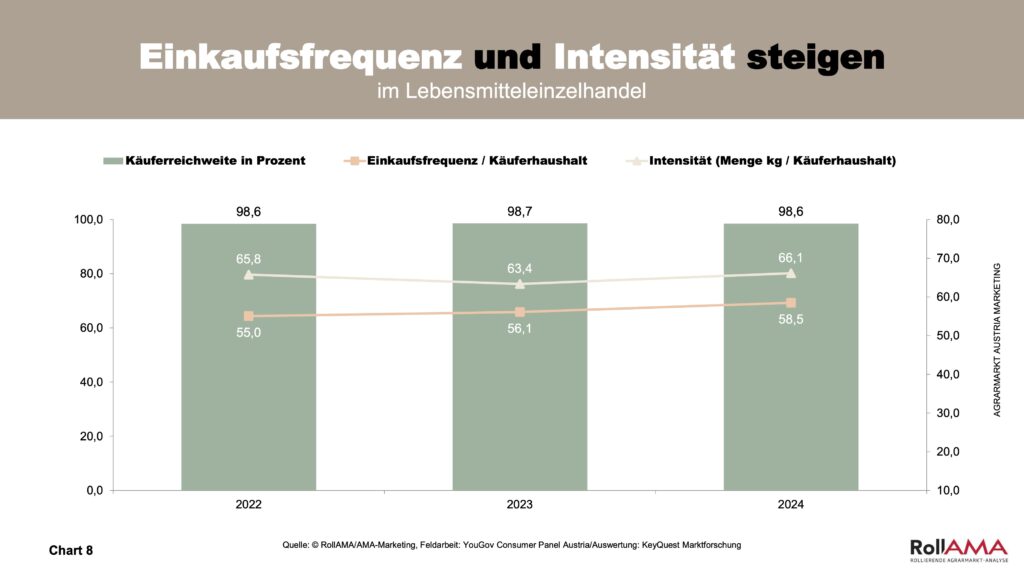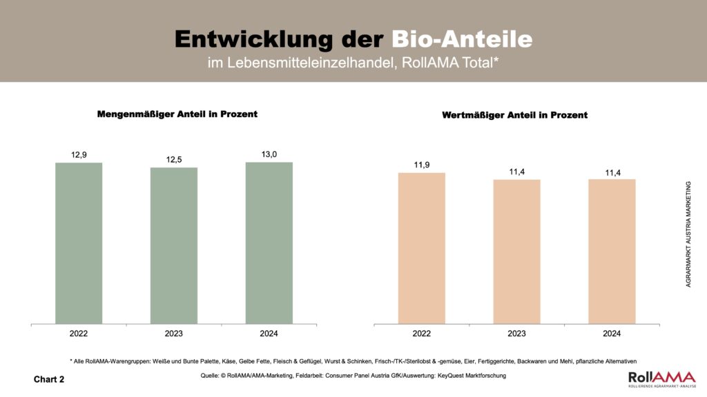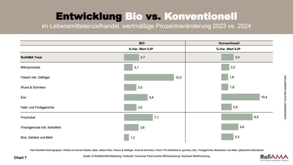 Der Markt für Biofleisch ist im Jahr 2024 weitergewachsen, auch wenn der Bioanteil mit 7,6 Prozent noch auf einem vergleichsweise niedrigen Niveau liegt. Die RollAMA-Zahlen belegen eine steigende Nachfrage nach Biofleisch – ein Hinweis darauf, dass Verbraucher zunehmend Wert auf Tierwohl und ethische Aspekte beim Einkauf legen. Auch Bio-Obst und -Gemüse gewinnen an Bedeutung, was auf veränderte Ernährungsgewohnheiten und neue Kochgewohnheiten zurückzuführen ist. Im Gegensatz dazu bleibt das Wachstum bei Bio-Eiern geringer, hier schränken auch Verfügbarkeitsengpässe das Angebot ein (Chart 7).