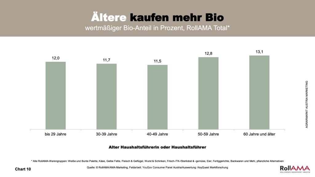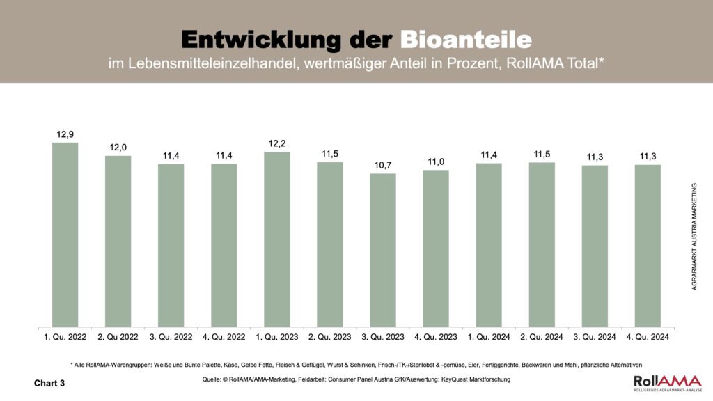 Die Schwankungen in den einzelnen Quartalen sind im Gegensatz zu den Vorjahren gering, was darauf hindeutet, dass Bio keinen Saisonen folgt, sondern ganzjährig eine hohe Bedeutung beim Lebensmitteleinkauf aufweist (Charts 3 und 4).