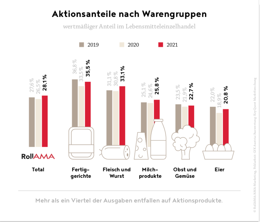 Die einen greifen gerne zu Aktionen, die anderen vermehrt zu Bio, viele zu beidem. Die Ausgaben für Bioprodukte stiegen 2021 um elf Prozent auf fast 800 Mio. EUR, was einem Anteil von elf Prozent am Gesamtmarkt entspricht. Die höchsten Bioanteile mit mehr als 30 % werden bei Milch gemessen, knapp ein Viertel der Ausgaben für Eier entfallen auf Bio sowie ein Fünftel der Gemüseausgaben. Von einem niedrigen Niveau aus kommt Fleisch 2021 auf nun sechs Prozent Bioanteil.