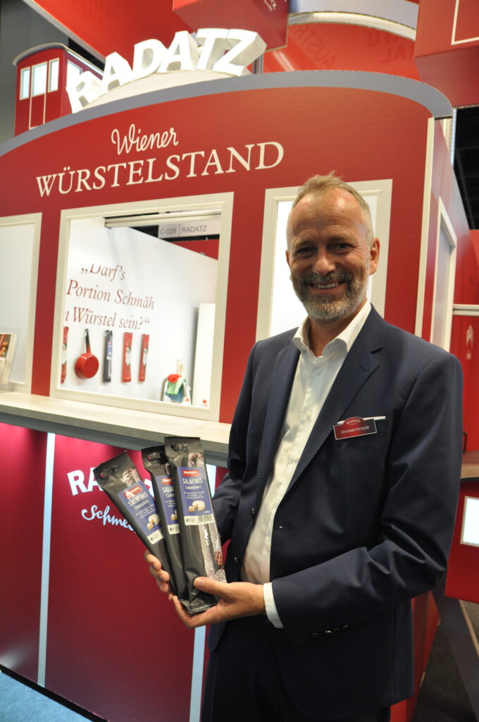 Österreichs Farben für die Fleischbranche vertrat unter anderen Radatz-Stastnik mit Verkaufsdirektor Johann Pichler an der Spitze: „Unser Exportanteil ist inzwischen auf über zehn Prozent angewachsen. Deutschland ist unser wichtigstes Exportland. Daher sind wir in regelmäßig Köln. Die Anuga 2023 hat unsere Erwartungen übertroffen, vor allem neue Kunden haben uns hier besucht.“ Als Messeneuheit präsentierte das Wiener Unternehmen die Salafinis mit Original Camembert und Edelschimmel. Eine Weiterentwicklung der erfolgreichen Camembert-Salami von Stastnik. Dazu Johann Pichler: „Unser Slogan für diese Produkte lautet ‚Slow-how.‘ Ich finde, das sagt alles über unsere Philosophie. Weiters konnten wir wie immer unsere Käsekrainer geschmackvoll präsentieren und unser 125-Jahre-Jubiläumin den Mittelpunkt stellen.“