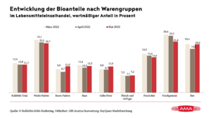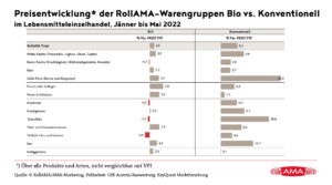 Ein detaillierter Blick auf die Preisentwicklung zeigt, dass die Preise für biologische Lebensmittel im AMA-Warenkorb weniger stark gestiegen sind als jene für konventionelle. Während die Preise für den Zeitraum Jänner bis Mai 2022 bei konventionellen Produkten um 6,5 Prozent gegenüber der Vorjahresperiode zugelegt haben, beträgt die Preissteigerung beim Bio-Warenkorb 2,5 Prozent.