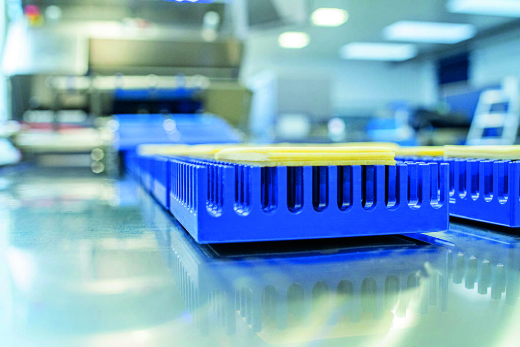 Provisur Technologies steht für innovative Technik und integrierte Produktionssysteme, die in der industriellen Lebensmittelverarbeitung eingesetzt werden. Mit dem neuen Formax Free Movement System (FMS) präsentiert das Unternehmen auf der IFFA eine echte Weltneuheit, die das Produkthandling revolutioniert: FMS ist ein außerordentlich kompaktes, flexibles und hygienisches Handlingsystem für geschnittene Lebensmittel, das im Vergleich zu herkömmlichen Systemen den Platzbedarf um etwa 50 Prozent reduziert. Das Herzstück der Anlage besteht aus einer Handling- und Pufferplatte und den Transporteinheiten, sogenannten Movern, die dank Mag- nettechnologie frei bewegbar sind. © Beigestellt
