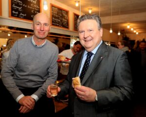 Das Geschäft, schmal rechteckig geschnitten, teilt sich der Länge nach in Schank bzw. Vitrinen- sowie in einen den Gästebereich, zwei in der Wand eingelassene Nischen bieten Sitzgelegenheiten. Die Eröffnung am 15. November war ein rauschendes Fest. Neben vielen Freunden, Bekannten und Geschäftspartnern schaute auch der Bürgermeister vorbei. Den Autor dieser zeilen begrüßte er jovial mit „Sie san ja a echta Feinspitz“, was dieser einfallslos mit einem „Sie aber auch“ konterte. „Keep it simple“ jedenfalls lautet das Motto der neuen Schinkenbar. Klar, handgeschnittenen Beinschinken gibt es, auch zartes Roastbeef, dazu einige Weine, Sprudeliges (geht immer ) oder das süffige XXXXX. Bier. Nun aber zum Interview.