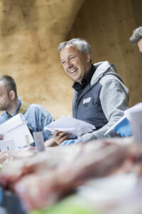 Bis auf den letzten Platz gefüllt war der Autobus, der zum Mustergut der Brauerei Stiegl nach Wildshut ausrückte. An Bord ging es lebhaft wie auf einer Klassenfahrt zu, doch die Themen unter den Fleischproduzenten und -verarbeitern waren gänzlich andere als unter Pubertierenden: Aktuelle Kilopreise für Rindfleisch, Rezepttipps und Unterschiede in der Fressleistung der eigenen Kälber stimmten auf einen Tag ein, der minutiös vorbereitet worden war und allen Beteiligten lange in Erinnerung bleiben wird: Neun Kälber aus drei Ländern sollten blind verkostet werden, um den Einfluss der Fütterung auf die Fleischqualität mit den eigenen Sinnen zu erfassen. Sowohl für Züchter als auch für Verarbeiter war dieser direkte Vergleich Neuland –, das zeigte auch die hohe Beteiligung.