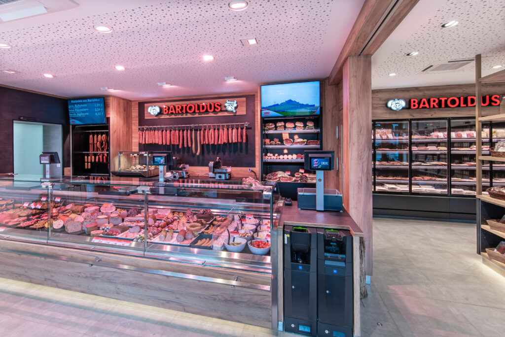Die Landmetzgerei Bartoldus mit angeschlossenem Partyservice liegt im deutschen Borgenreich bei Paderborn. Nach intensiven Gesprächen und einer sorgfältigen Bedarfsanalyse entschieden sich die Familie Bartoldus und das Hanke Team für die Planung eines Hybrid-Ladens. Im traditionellen Ladengeschäft wurde eine 4,70 Meter lange Santana III Theke installiert. Spezielle Kühlgeräte in der Ladenrückwand sorgen für die optimale Lagerung von Schinkenspezialitäten und Dauerwürsten. Ein speziell angefertigtes Gehänge unter der hinterleuchteten Bartoldus-Präsentation zeigt die hauseigene Salami und ergänzt das breite Angebot. Eine kleine heiße Theke wurde integriert, um den Bedürfnissen von Imbisskunden gerecht zu werden. Neben der Kühltheke erleichtert ein Bezahlautomat von Bizerba die Abwicklung des Tagesgeschäfts. Nach Geschäftsschluss wird die Glaswand neben dem Bezahlautomaten geschlossen und der 24/7-Shop erwacht zum Leben.