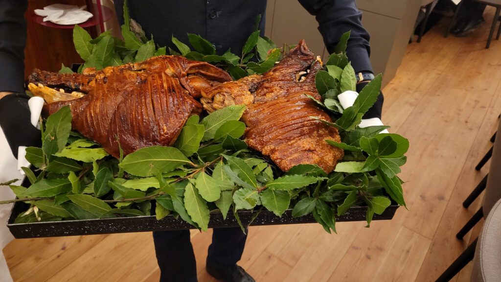 Ein weiteres Highlight des Events war ein Besuch auf dem Bauernhof von Toni Krispel, der seit mehr als 20 Jahren seiner Leidenschaft, dem Wollschwein frönt – und dabei eng mit der Fleischerei Eduard Scharfy zusammenarbeitet. Ursprünglich von der Arche Austria erhalten, liefert die etwa 300 Jahre alte Rasse mit einem etwa 70 %igen Fettanteil viele gesunde Omega-3-Fettsäuren. Wie gut das schmecken kann, wurde selbstverständlich auch gleich gezeigt. Die Spezialität vom Genussgut Krispel in Neusetz bei Hof bei Straden, bekannt auch für seine feinen Weine, ist der Neusetzer, ein bis zu 15cm dicker Rückenspeck, der im Basalttrog zwischen sechs und neun Monaten im Meersalz und verschiedenen Kräutern bei einer Temperatur von 2 bis 4 ° C reift.
