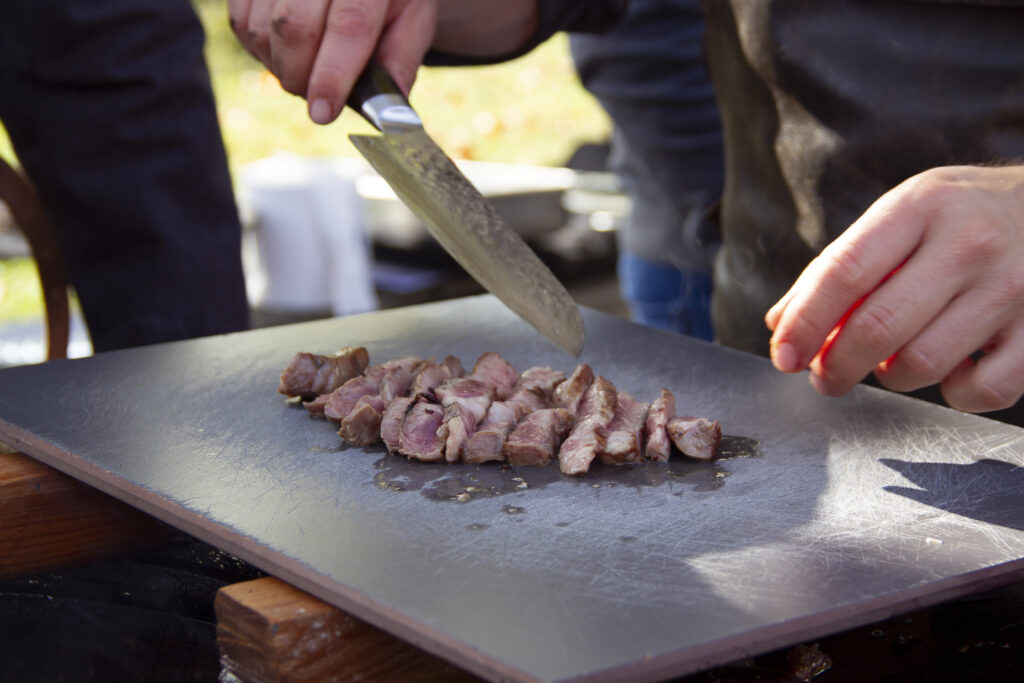 Zudem fand sich auch ein „Naked Pig“-Speck vom ober- östereichischen Biohof Thomabauer, von Simon Humer auf dem Grill wieder. Humer vermarktet einen Teil seiner 160 maisfrei gefütterten Mastschweine selbst, zwei Drittel davon gehen aber an Bio-Schwein Austria. Die Ferkel kauft er von der Versuchsanstalt Raumberg-Gumpenstein – von dort kommen auch seine britischen Berkshire-Schweine. „Die sind sehr gutmütig und brav. Außerdem ist die Fettauflage extrem hochwertig, die Konsistenz des Fettes ist buttrig, kernig, ein festes Fett. Warm kann man das kaum essen, aber als kalter Speck ist es ein Traum. Außerdem ist das Fleisch intramuskulär toll gemasert.“ Nicht umsonst nennt man die Berkshire die „Kobe-Rinder“ unter den Schweinen. Ein Problem sieht Humer allerdings, wie viele Bio-Bauern, in der Klassifizierung, da er die sogenannte S-Klasse, diese zeichnet einen mehr als 60 prozentigen Muskelfleischanteil aus, nie erreichen kann. „Von der Genetik her sind die resistenten Rassen einfach anders zu beurteilen als die Hochgezüchteten und haben daher auch viel mehr Fett.“ Was er aber als sehr positiv anmerkt, ist, dass er als Bio-Schweinezüchter ein besseres Ansehen hat und so mit einem Fixpreis rechnen kann.