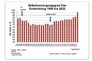 Die Legehennenbestände sind so hoch wie nie, seit dem Käfigverbot 2009. Der Selbstversorgungsgrad steigt seit der Umstellung auf alternative Haltungsformen kontinuierlich an. Damit können wir uns bereits zu über 100 % selbst mit Eiern versorgen.
