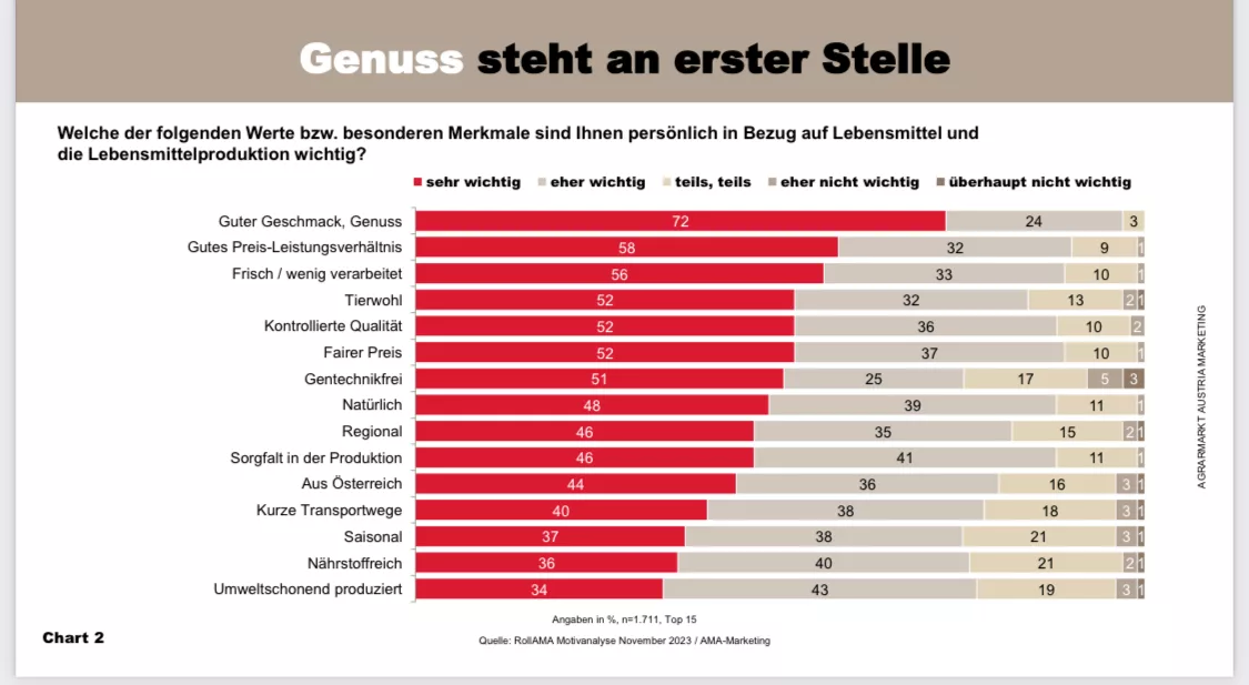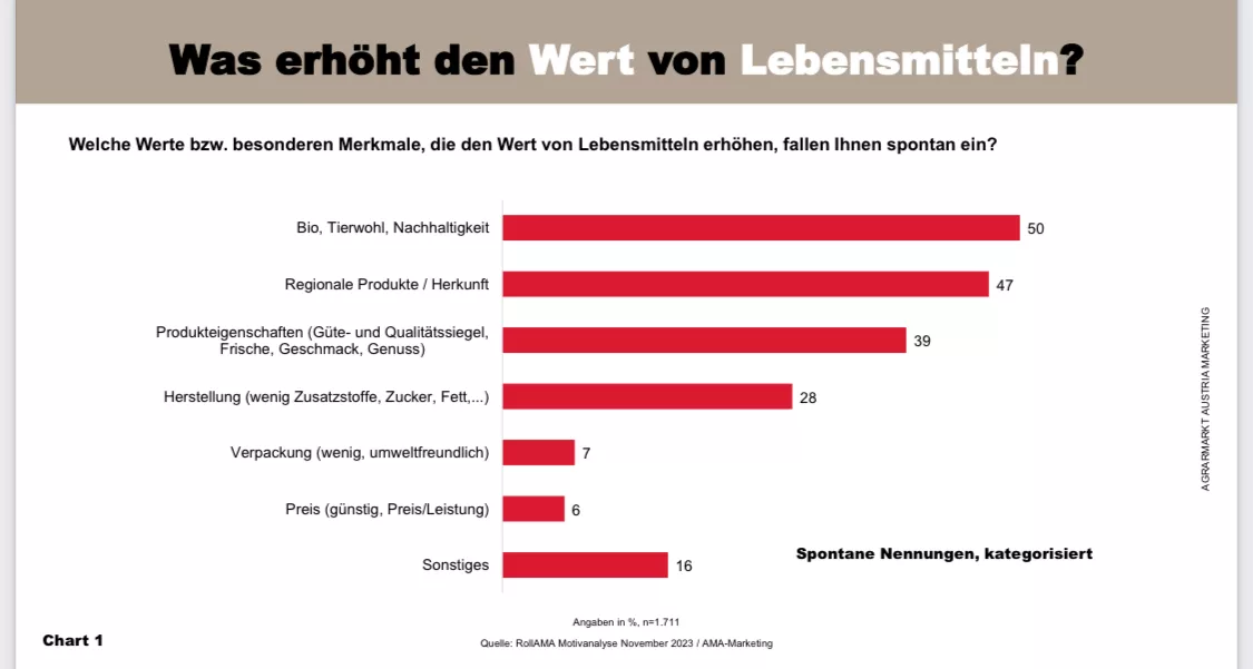 Anlässlich des Weltverbrauchertags am 15. März hat die AMA-Marketing eine Befragung durchgeführt, um zu ermitteln, welche Werte Österreicherinnen und Österreicher beim Kauf von Lebensmitteln am wichtigsten finden. Als zentrale Faktoren wurden Bio, Nachhaltigkeit, Tierwohl und die Herkunft der Produkte hervorgehoben. Der Bericht zeigt, dass Konsumentinnen und Konsumenten beim Einkauf großen Wert auf diese Aspekte legen und besonders die Herkunft und Regionalität von Lebensmitteln als bedeutend einschätzen.
