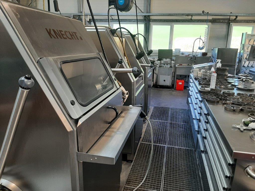 Alle genannten Maschinen stammen übrigens aus dem Hause Knecht Maschinenbau. Einige weitere kleinere Maschinen, auf denen heute Rundmesser oder spezielle hinterschliffene Kreuzmesser präzise geschärft werden, kamen im Laufe der Zeit auch noch hinzu. Egal, ob vollautomatisch oder manuell – der derzeitige Maschinenpark ermöglicht es dem Unternehmen einen Großteil der Werkzeuge für die Lebensmittelindustrie professionell nachzuschleifen.