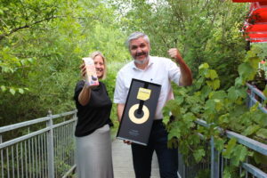 Bettina und Franz Habel nehmen von Sonja Zauner (GF PRODUKT) (v.l.) für die „Vulcanossi Kürbiskern“ die Urkunde für den 1. Platz in der Kategorie Selbstbedienung entgegen.