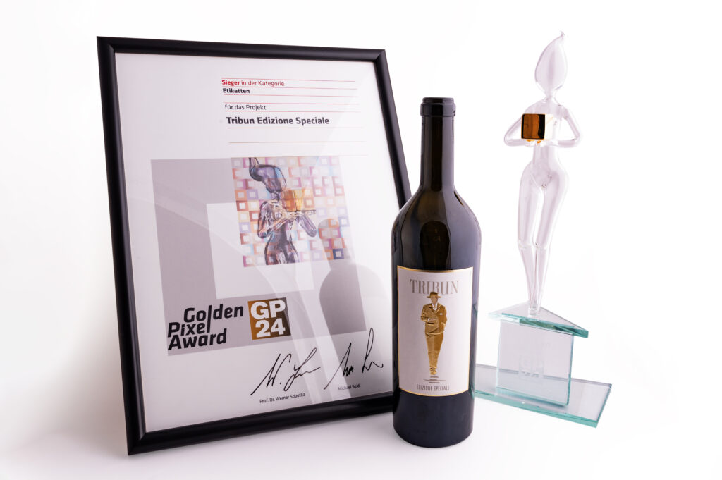 Nur wenige Tage später folgte die nächste Ehrung: Marzek wurde mit dem Golden Pixel Award in der Kategorie „Etiketten“ ausgezeichnet. Prämiert wurde das Etikett „Tribun Edizione Speciale“ für Kaisergarten Tom Nier KG, das durch sein innovatives Design und die professionelle Umsetzung beeindruckte. Besonders hervorgehoben wurden die präzise Gold-Heißfolienprägung, die feine Micro-Reliefprägung und die intensive Gravur-Reliefprägung, die das Etikett zu einem echten Blickfang machen.