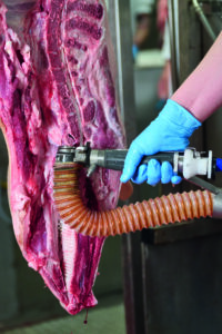 Fu?r sichere Abla?ufe in der Schlachtung setzt der Fleischverarbeiter den Quantum Flex-TrimVac ein. Das Rundmesser wird in Kombination mit einer Vakuumanlage zur Entfernung von potenziell riskantem Ru?ckenmarkgewebe oder innen liegendem Fett aus schwer zuga?nglichen Bereichen genutzt. Das geschlossene System saugt das Risikomaterial direkt ab und transportiert es zur Entsorgung. Das Werkzeug mit seiner besonders schnell rotierenden Klinge ermo?glicht ein sehr pra?zises Arbeiten.