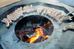 Dass sich Toni Krispel fu?r den Auftritt als Familie entschieden hat, liegt an einem praktischen Grund: Die Wu?rste sollen als eigenständige Bio-Kreation wahrgenommen werden und nicht unmittelbar mit ihrer „Konkurrenz“ an der Frischetheke verglichen werden. Denn der Leberkäse „Franz Wurscht“ im Glas unterscheidet sich nicht nur durch dieses Gebinde eben von herkömmlicher Aufschnittware fu?rs Semmerl. Auch die Packung mit vier Chorizos im starken Kaliber sind eine Alternative fu?r alle, die im Delikatessenhandel bisher zu scharfen Debrezinern griffen. Aber sie schmecken eben auch deutlich anders als die härteren (und oft eindimensional paprikascharfen) spanischen Angebote im hiesigen Handel. Die Versorgung mit den neuen Spezialitäten, aber auch mit Klassikern wie dem Wollschwein-Karree u?bernahmen zwei Diplom Fleischsommeliers. Daniel Weißer, der Chefkoch des Genussguts, stand dabei mit Bernhard Steinhauer am Grill. „Nicht u?berall auf der Welt sucht man die Zartheit beim Schweinefleisch“, unternahm er einen Ausflug in die Zerlegungsmethodik spanischer Schweine. Da geht es vielmehr um gute Marmorierung der Cuts wie Presa (Nackenkern) oder Pluma (Federstu?ck). Dass man diese ideal zubereiten kann, demonstrierte der Leiter der „Steirischen Grillschule“ den Gästen. Vor allem die Pluma mundete noch heiß vom Designgrill von Martin Krainer, der aus Corten- und Edelstahl gefertigt wurde.