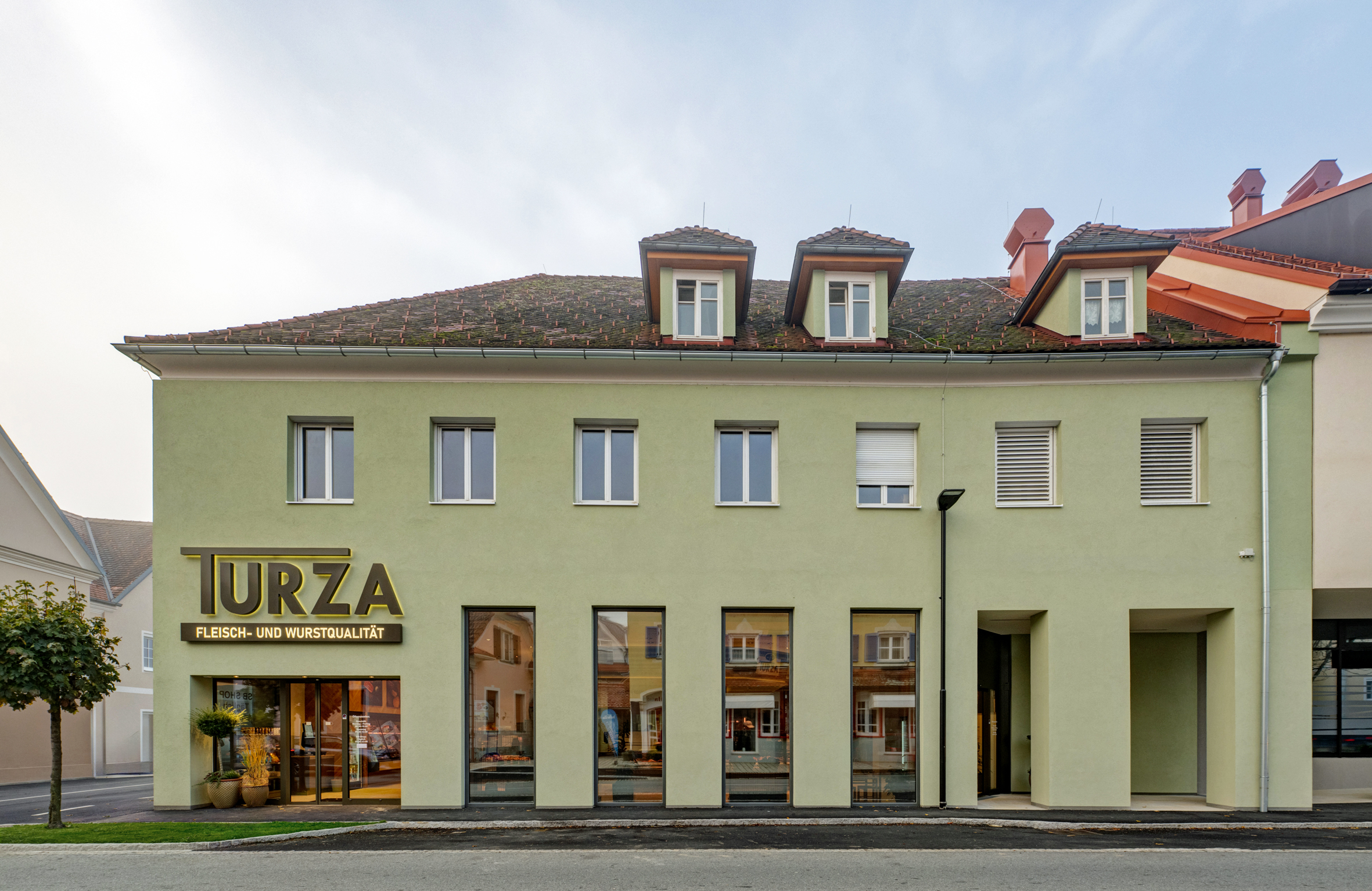„Mit dieser Investition wollten wir einen Meilenstein in unserer Firmengeschichte setzen. Wir haben die Verkaufsfläche verdoppelt, großzügige Sitzbereiche geschaffen und die Küche samt Vorbereitungsräumen vollständig modernisiert“, erklärt Philipp Turza. In der Ortsmitte entstand ein neues Ensemble mit Gastronomie, Grünflächen, Gehwegen und künftig bis zu 120 Parkplätzen. „Wir sind der Fixpunkt der neuen Mitte“, sagt Philipp Turza. Ilz darf sich seit dem letzten September als Ortschaft mit einem der schönsten Fleischerfachgeschäfte der Welt bezeichnen. Aufgesperrt wurde das neue Geschäft bereits Mitte September, die offizielle Eröffnungsfeier erfolgte im Oktober – mit enormem Andrang. Wo früher die Großeltern das Gasthaus Friedrich mit einer Metzgerei betrieben, steht heute ein „Genusspol im Vulkanland“: Fleischerei, SB-Shop und Bistro. Holztafellungen und lindgrüne Sitzpolster erinnern bewusst an das ehemalige Gasthaus. Das benachbarte verpachtete Lokal trägt weiterhin den Namen „Friedrichs“.