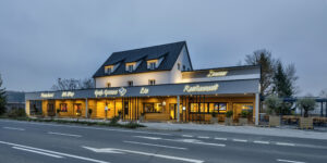Drei Jahre später hatte er es: „Ja, jetzt passt’s!“ Ein nahezu 45 Meter langes Gebäudeensemble mit weit sichtbarer Leuchtschrift an der B54 zwischen Graz und Wien, 58 Parkplätze vor, hinter und unter dem Gebäude. Gegenu?ber liegt ein zentraler Busknotenpunkmit vier Haltestellen, und auch der Fernradweg fu?hrt direkt an seinem Grundstu?ck vorbei.