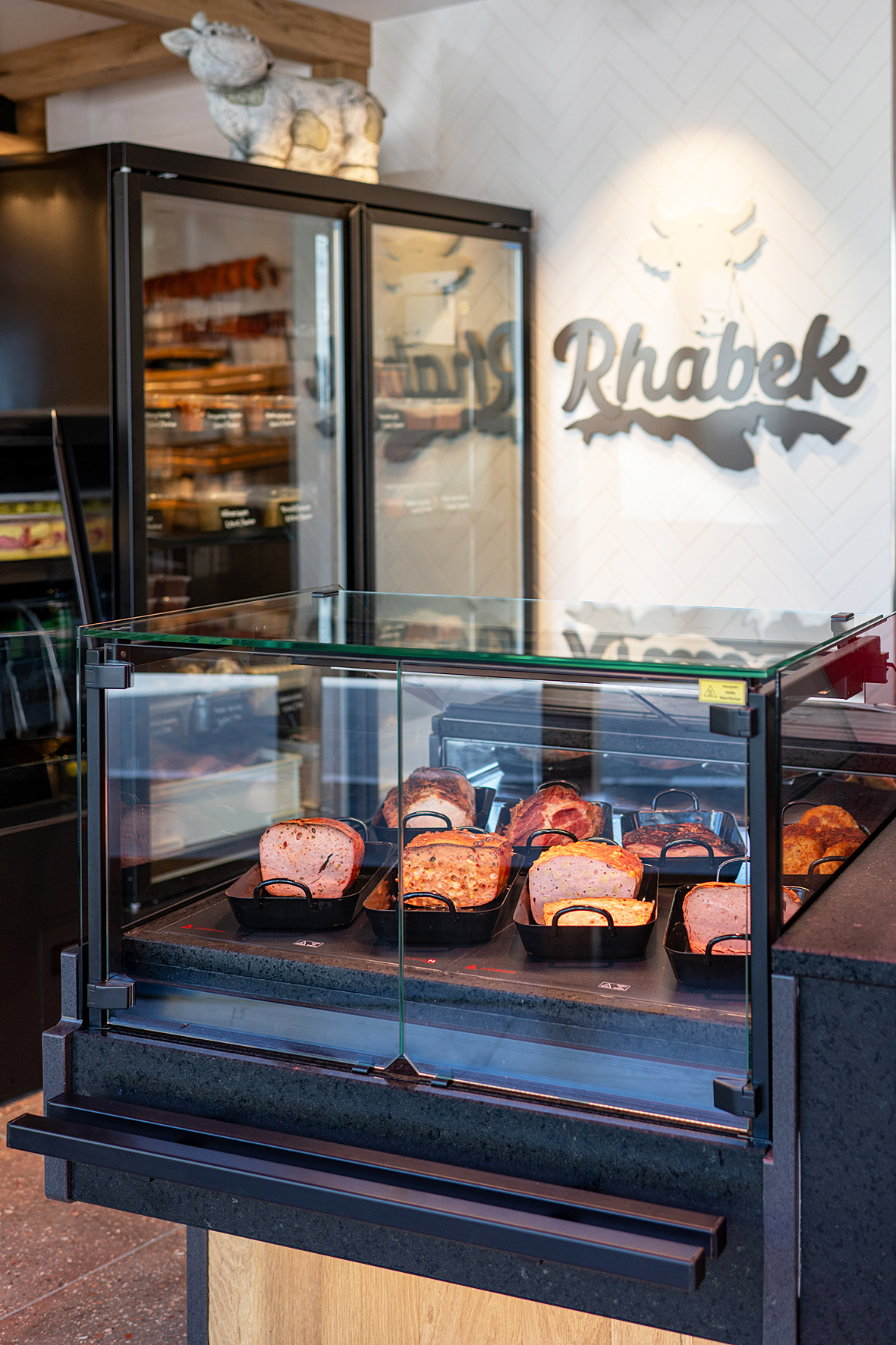 Bei der Fleischerei Rhabek ist Frische und Handwerk sichtbar. Die Auslage ist gegenüber der früheren Theke näher am Kunden. Die drei verschiedenen Leberkäsesorten, die Braten, Fleischlaberln und Schnitzel werden in gusseisernen Kasserollen auf den zwei Platten 64 energieeffizient warm gehalten.