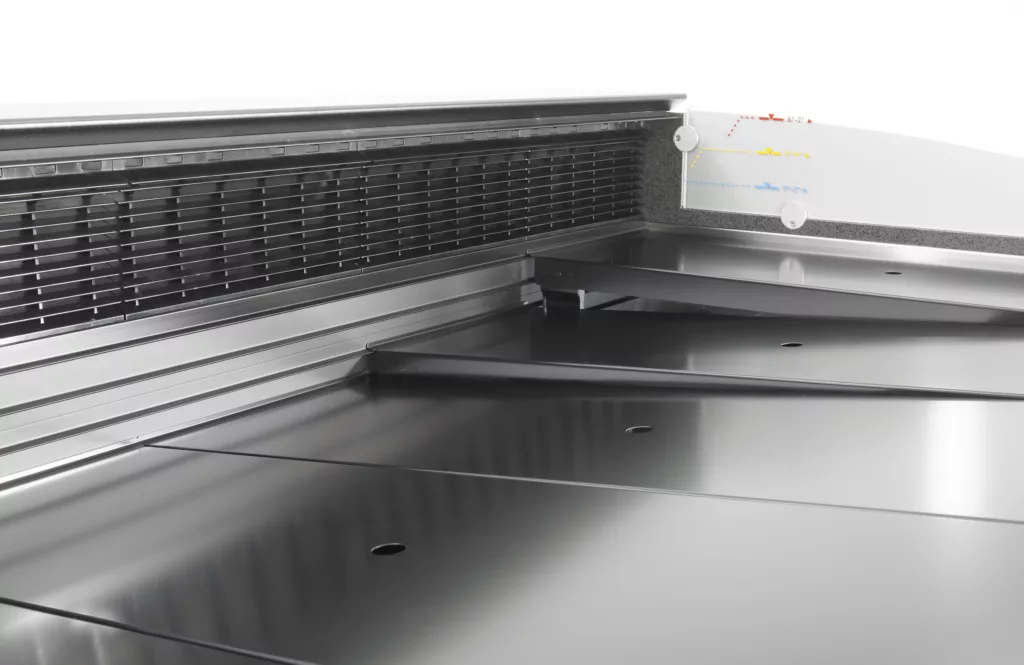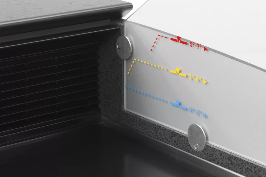 Ku?hltheken wie die Baureihe Sirius®3 von Aichinger sind serienma?ßig mit manuell verstellbaren Warenbo?den ausgestattet. Dies ermo?glicht eine angepasste Warenpra?sentation. Um eine optimale Ku?hlfunktion zu gewa?hrleisten, ist es notwendig, alle Warenbo?den der jeweiligen Temperaturzone in derselben Position einzustellen. Wenn die Warenbo?den um mehr als eine Rasterstufe versetzt werden, kommt es durch den entstehenden Luftspalt zu Luftzirkulationen und zu einer Beeintra?chtigung der Ku?hlfunktion.