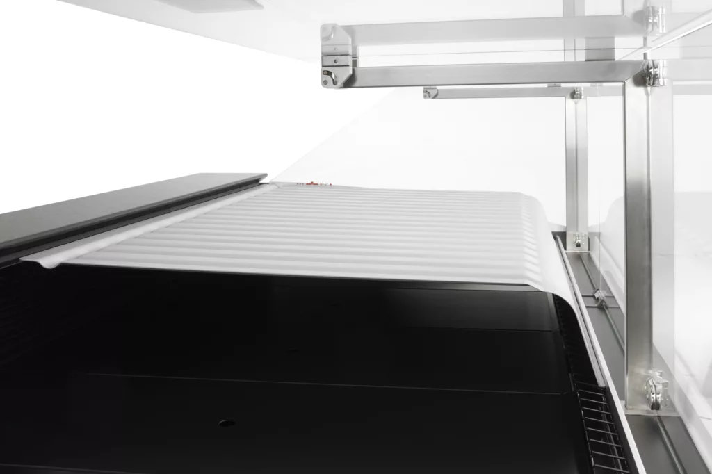Die Nachtabdeckung der Waren in der Ku?hltheke reduziert Zeit und Kosten. Wichtig dabei ist, dass die Nachtabdeckung an der Prallscheibe anliegt und sich u?ber dem Ru?ckluftgitter befindet. Es ist zudem darauf zu achten, dass die Abdeckungen lu?ckenlos aneinandergelegt werden. So wird eine unkontrollierte Luftzirkulation vermieden. Werden die Nachtabdeckungen nicht lu?ckenlos aneinandergelegt, entsteht ein Luftspalt, der das optimale Lagerklima sto?ren kann.