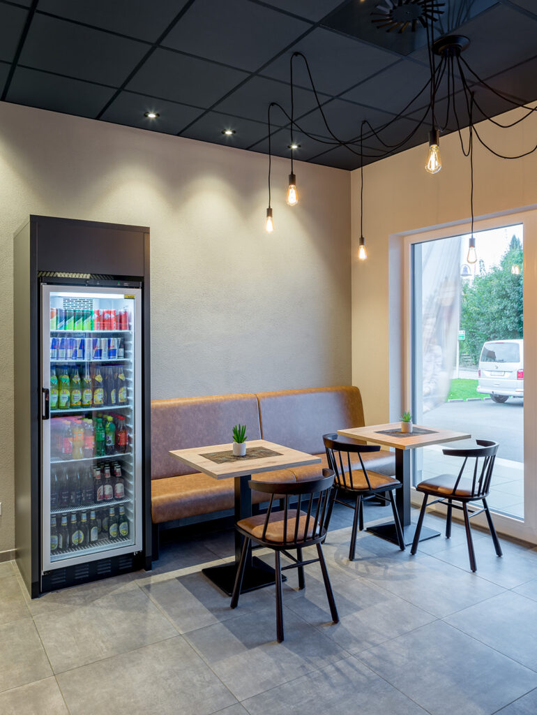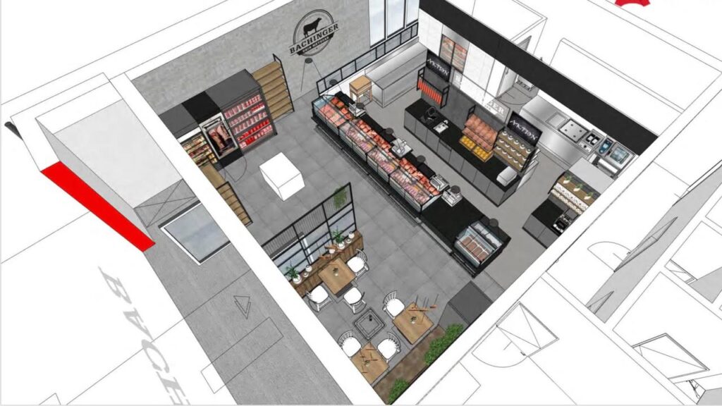 Die Ladenla?che betra?gt genau 103 Quadratmeter. Als Partner fu?r die Gescha?ftsplanung und Einrichtung entschieden sich die Bachingers fu?r Ladenbauprofi Aichinger. Die Gebietsverkaufsleiter Andreas Raab und Aichinger-Objektplaner Bernhard Halbartschlager planten und realisierten gemeinsam mit der Familie Bachinger und den Professionisten vor Ort ein wahres Traumgescha?ft. Aichinger verantwortet die Planung, den Entwurf und die Lieferung der Theke, die Mo?blierung, die Ru?ckwand, die Edelstahlmo?bel und den Kochbereich, die Gestaltung sowie Bestuhlung des Ladens. Die Thekenanlage ist fu?nf Meter lang. Verbaut wurde das Modell Sirius3, dazu ein Meter Sirius fu?r die Heiße Theke sowie eine Sirius fu?r die Ausgabe.