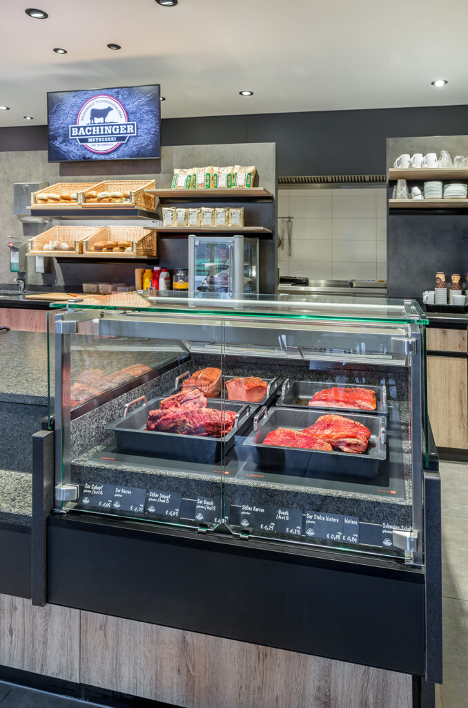 Beim Rindfleisch setzen die Bachingers auf Kalbinnen und Ochsen und die Knochenreifung. Im Dry Ager du?rfen die Steaks und Edelteile bis zu sechs Wochen reifen, ehe sie verkauft werden. Ta?glich werden fu?r die Feinschmecker frische Menu?s angeboten, das Zusatzsortiment wird in der Region produziert, sofern es geht.