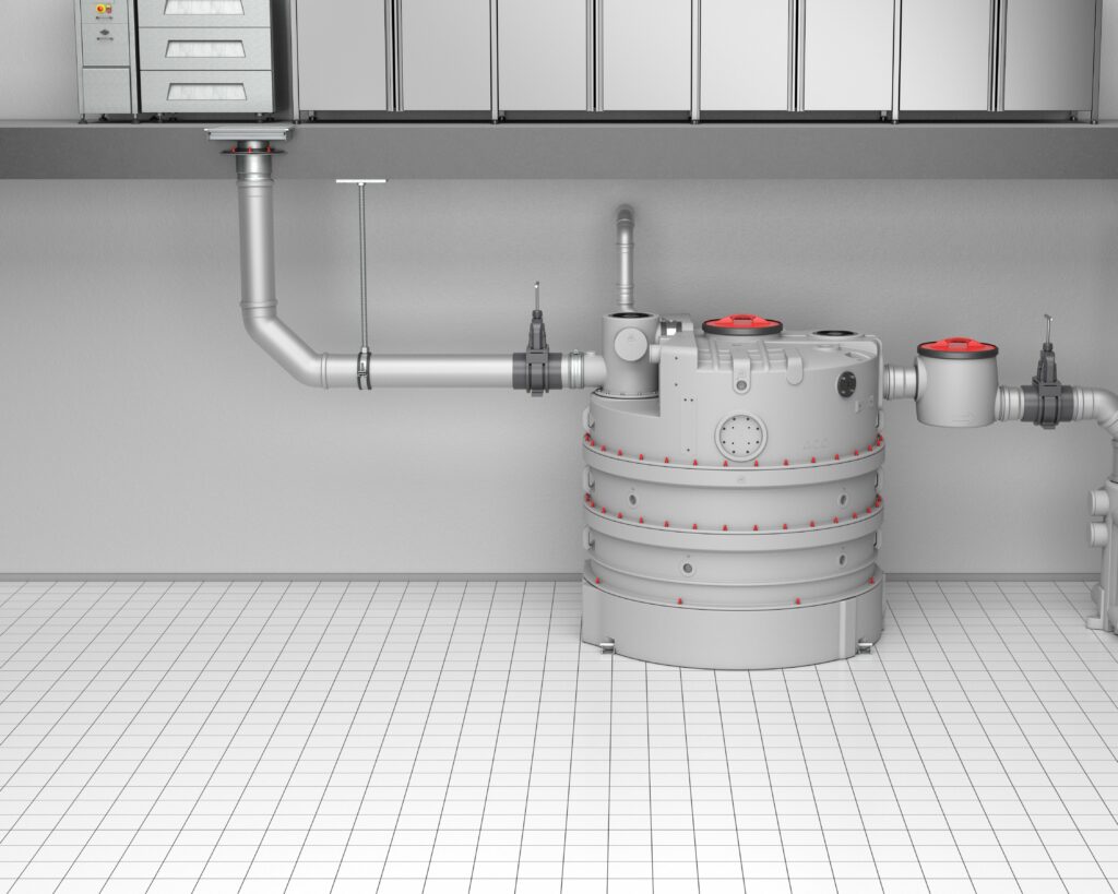 Der Behälter wurde multifunktional als Fettabscheider, Leichtflüssigkeitsabscheider und als möglicher Schlammfang konzipiert. Die Befüllung mit Wasser erfolgt automatisch über die Fülleinheit mit Magnetventil. Für einen optimalen Entsorgungsvorgang wurde der Boden zusätzlich zur Entsorgungsschräge mit einem Pumpensumpf ausgestattet.