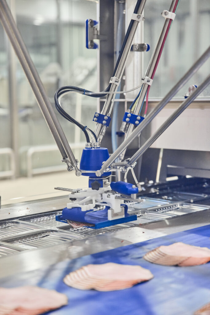Weitertransportiert werden die Aufschnittportionen vom Weber CompactBuffer, um anschließend vom Pick-Roboter WePick vollautomatisch, präzis und hygienisch mit bis zu 130 Picks pro Minute in den Hochleistungsthermoformer WePack 7000 einlegt zu werden. Vor allem der in den We-Pack integrierte Klebetisch zum Wechsel der Oberfolie „ist ein riesiger Gewinn für uns“, betont Jeton Syla, „wegen der vielen verschiedenen Foliensorten, die wir verarbeiten müssen und die wir nun viel schneller und vor allem einfacher wechseln können“.