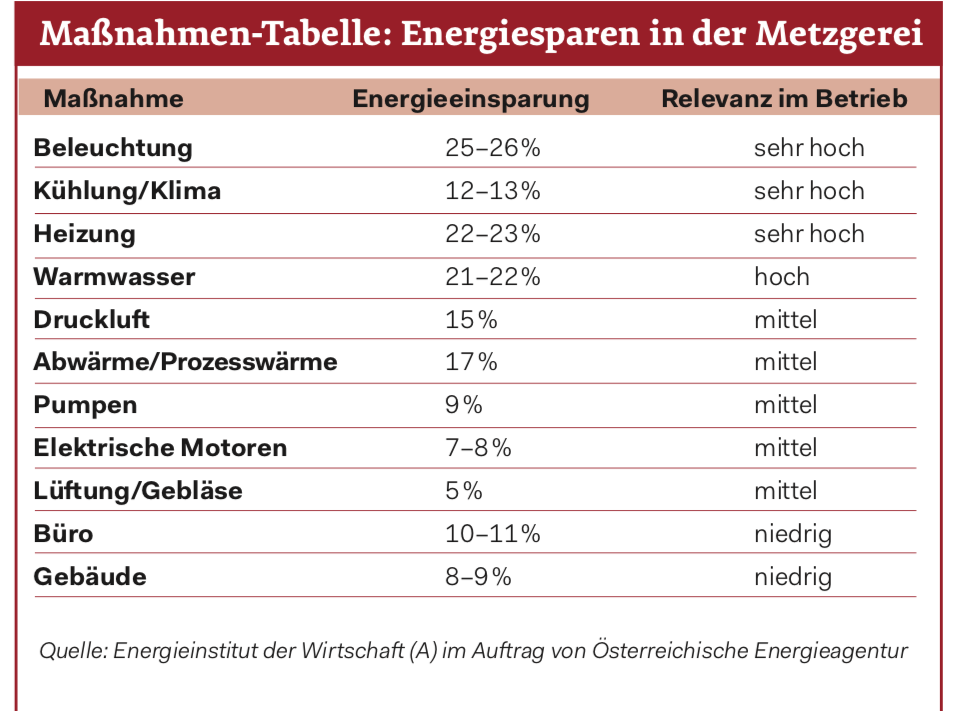 In Fleischereien sind viele Prozesse sehr energieintensiv. Laut dem Energieeffzienz-Beraternetzwerk verbrauchen Metzgereien im Jahr durchschnittlich 540.000 Kilowattstunden Energie. Die durchschnittliche Metzgerei hat zehn Mitarbeiter, etwa 700 Quadratmeter beheizte oder gekühlte Fläche und verarbeitet etwa 200 Tonnen Fleisch im Jahr. Etwa die Hälfte der Energie wird für Prozesswärme (Wurstkessel, Kochschränke) und Prozesskälte (Kühlhäuser) benötigt. Weitere 30 Prozent entfallen auf Heizung und Warmwassererzeugung. Der Rest (20 %) wird von Maschinen mit Elektroantrieben, Licht und anderen elektrischen Verbrauchern verbraucht. Dies schlägt stark zu Buche: Die Energiekosten einer Metzgerei werden zu 70 Prozent durch elektrische Energie verursacht.