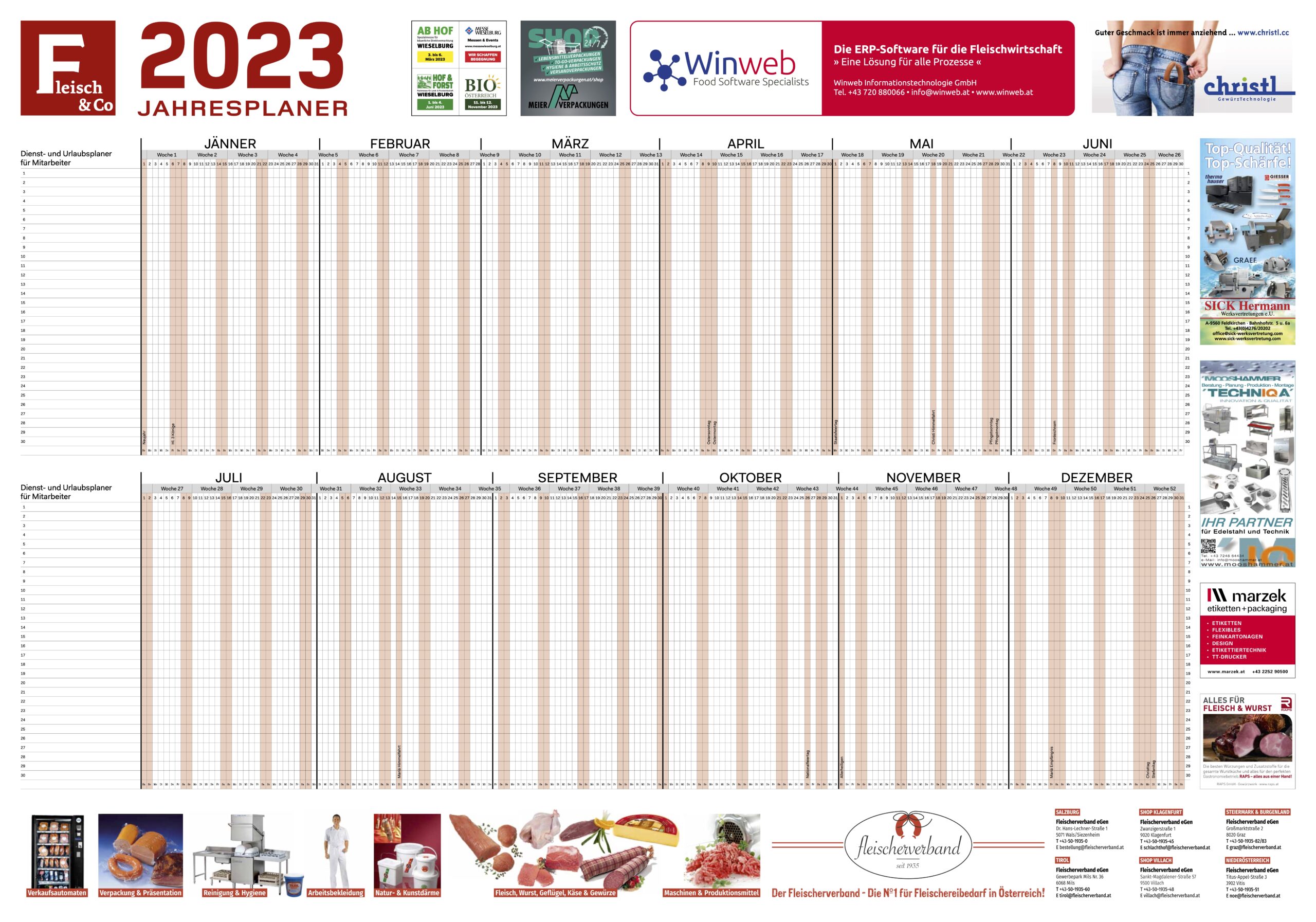 Der Wandkalender 2023 von Fleisch & Co bietet einen praktischen Jahresplaner mit den wichtigsten Branchen-Events. Und auf der anderen Seite finden Sie den ebenso praktischen Dienst- und Urlaubsplaner für sich und ihre Mitarbeiter:innen.