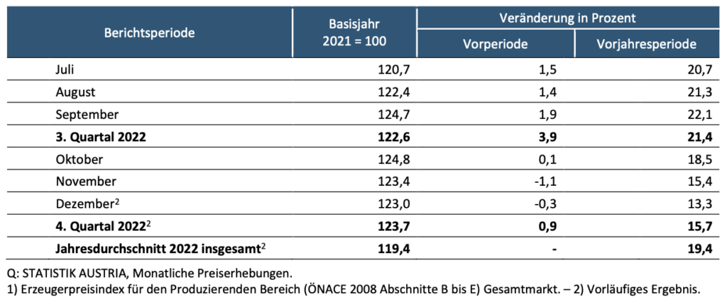 Der Indexanstieg im Dezember 2022 (+13,3 %) war vorwiegend auf gestiegene Preise im Bereich Energie (+33,2%) zurückzuführen. In den Monaten November und Oktober 2022 wurden noch Preissteigerungen um +39,7 % bzw. +48,8 % registriert. Damit ließ der Preisauftrieb im Bereich Energie im Dezember 2022 erneut nach. Ein Abflachen der Preisanstiege konnte auch für Vorleistungsgüter (Dezember 2022: +7,9 %, November 2022: +9,3 %, Oktober 2022: +11,6 %) beobachtet werden. Markante Teuerungen gab es im Dezember 2022 bei den Vorleistungsgütern für Holzund Zellstoff, Papier, Karton und Pappe (+21,1 %) sowie für Roheisen, Stahl und Ferrolegierungen (+13,8 %). Einen Anstieg um 7,6 % gegenüber dem Vorjahresmonat verzeichneten im Dezember 2022 die Preise für Konsumgüter. Investitionsgüter verteuerten sich gegenüber dem Vorjahresmonat um 4,4 %.