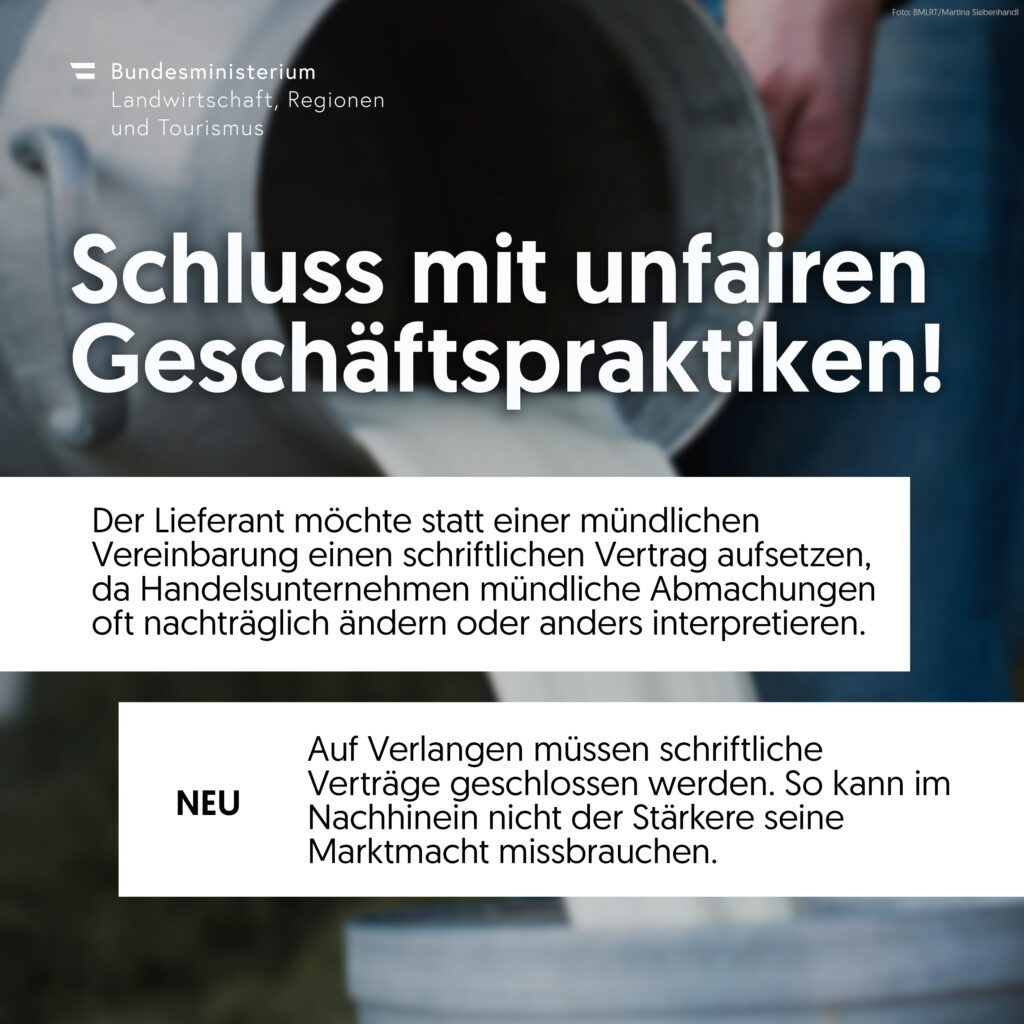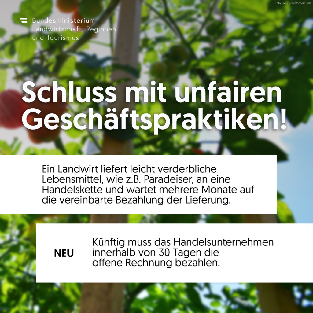 „Heute ist ein guter Tag für unsere Bäuerinnen und Bauern! Wir setzen einen Meilenstein im Kampf gegen unfaire Geschäftspraktiken, unter denen die Landwirtschaft leidet. Mit den Gesetzesänderungen und der Einrichtung einer nationalen Ombudsstelle können wir unfairen Geschäftspraktiken endlich einen Riegel vorschieben. Verspätete Zahlungen für verderbliche Waren, Auftragsstornierungen in letzter Minute, einseitige oder rückwirkende Vertragsänderungen, erzwungene Zahlungen des Lieferanten für die Verschwendung von Lebensmitteln und Verweigerung schriftlicher Verträge sind dann verboten“, betont Landwirtschaftsministerin Elisabeth Köstinger.