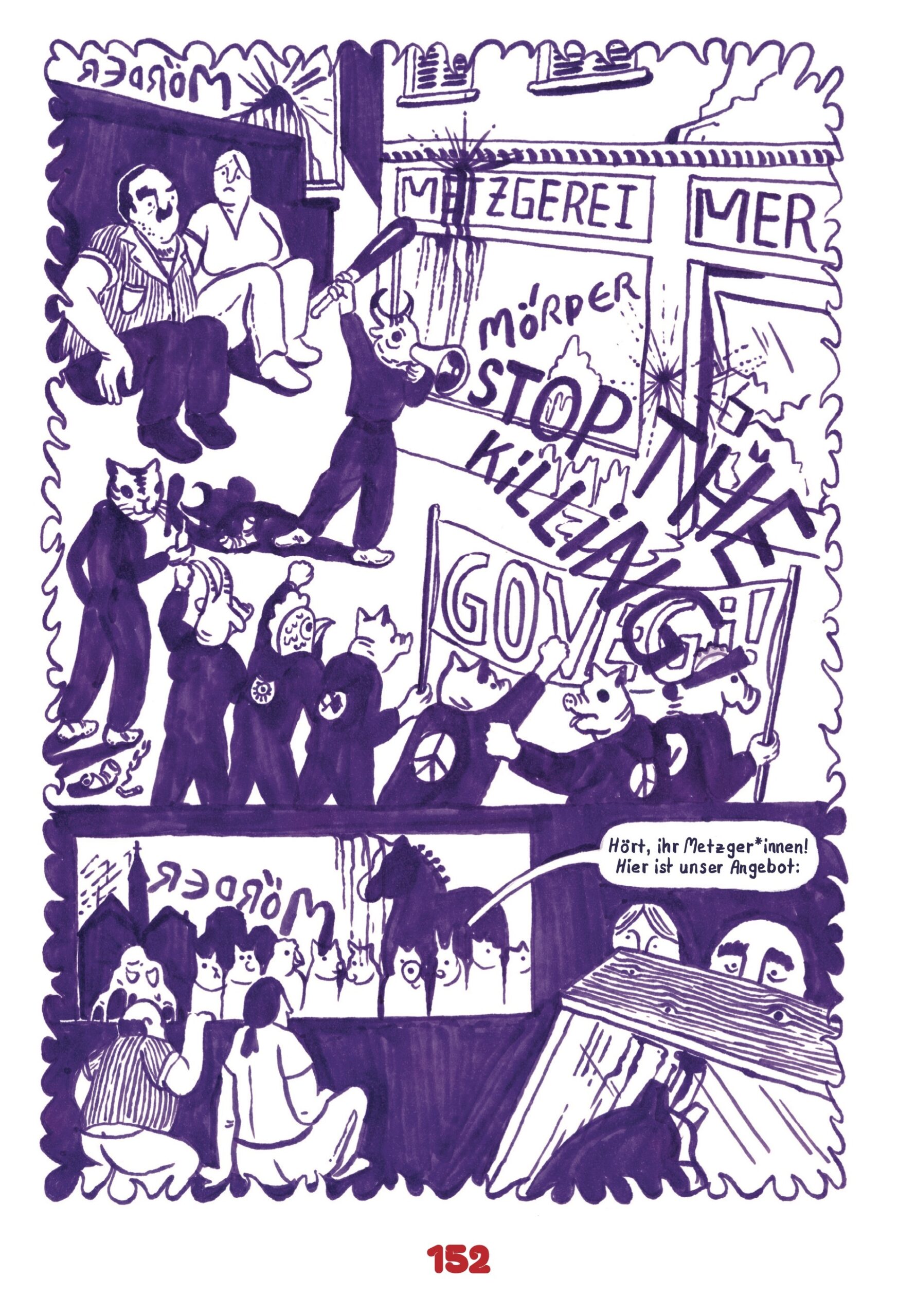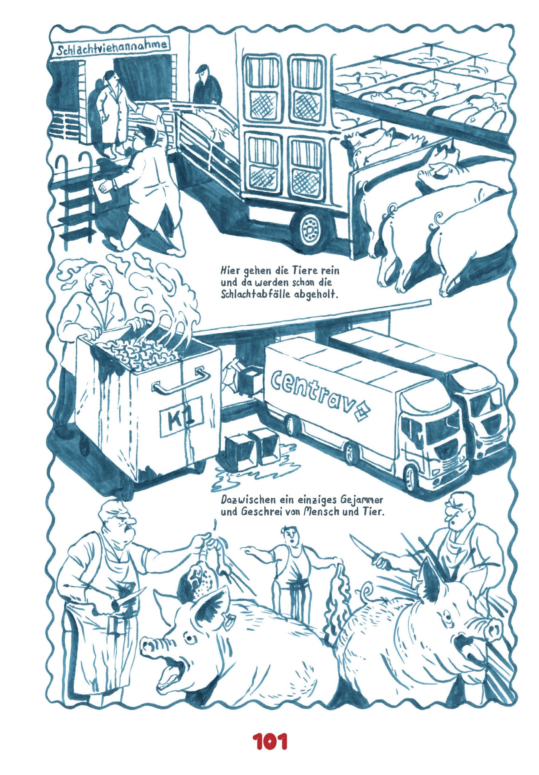Die Schlüsselszene von „Fleischeslust“ findet sich auf Seite 58: „Das Problem sind die Veganen und die Ausländer, die kein Schwein essen“, erklärt ein Gast am Stammtisch dem Metzger Erwin Merz, warum es im Einzelhandel nicht so gut läuft. Erst bei genauerem Hinsehen erkennt man, was zu Füßen des Verteidigers des Handwerks steht: ein Supermarkt-Sackerl! In Zeichnungen hat diese feinsinnige Beobachtung Martin Oesch festgehalten, der sich in dem Comic auch weitere 190 Seiten lang dem Geschehen rund um das fiktive Geschäft Merz widmet.