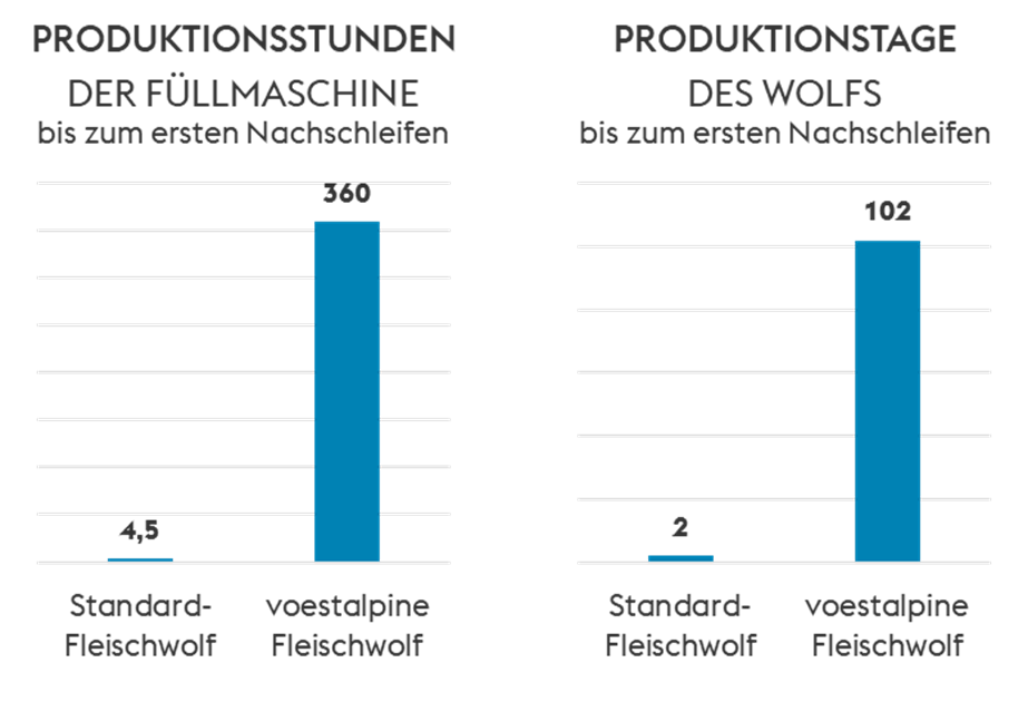 Aber warum sollten Sie sich mit der gewöhnlichen Leistung von Standardwerkzeugen zufriedengeben, wenn es eine intelligentere Lösung gibt – eine die mehr Effizienz und höhere Profitabilität ermöglicht? voestalpine High Performance Metals International bietet eine Reihe von Engineered Products an, deren Leistung optimiert ist und Ihren Lebensmittelverarbeitungsprozess erleichtern können. Eines dieser Engineered Products ist unsere voestalpine Fleischwolftechnologie, konzipiert für verschiedenste Anwendungen wie Rinderhack, Salami-Füllung oder Burger-Patty-Produktion. Durch den Einsatz der voestalpine Fleischwolftechnologie konnten die Kunden ihre Maschinen bis zu 102 Tage lang in Betrieb halten, bevor ein Nachschleifen der Teile erforderlich war. Dies ist eine enorme Verbesserunggegenüber dem früheren Standard-Industrie-Kit, welcher alle zwei Tage ein Nachschleifen erforderte. In der Wurstproduktion konnten Kunden, die die voestalpine Fleischwolftechnologie einsetzten, ihre Füllmaschinen 360 Stunden lang in Betrieb halten, bevor ein Nachschleifen erforderlich war. Mit der Standardtechnologie mussten sie die Teile bereits nach 4,5 Produktionsstunden nachschleifen.
