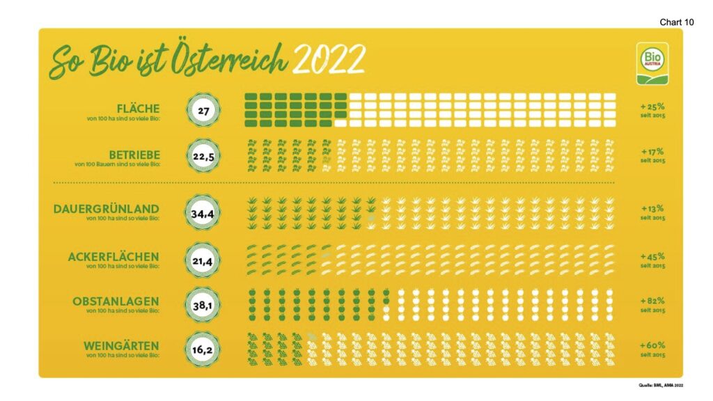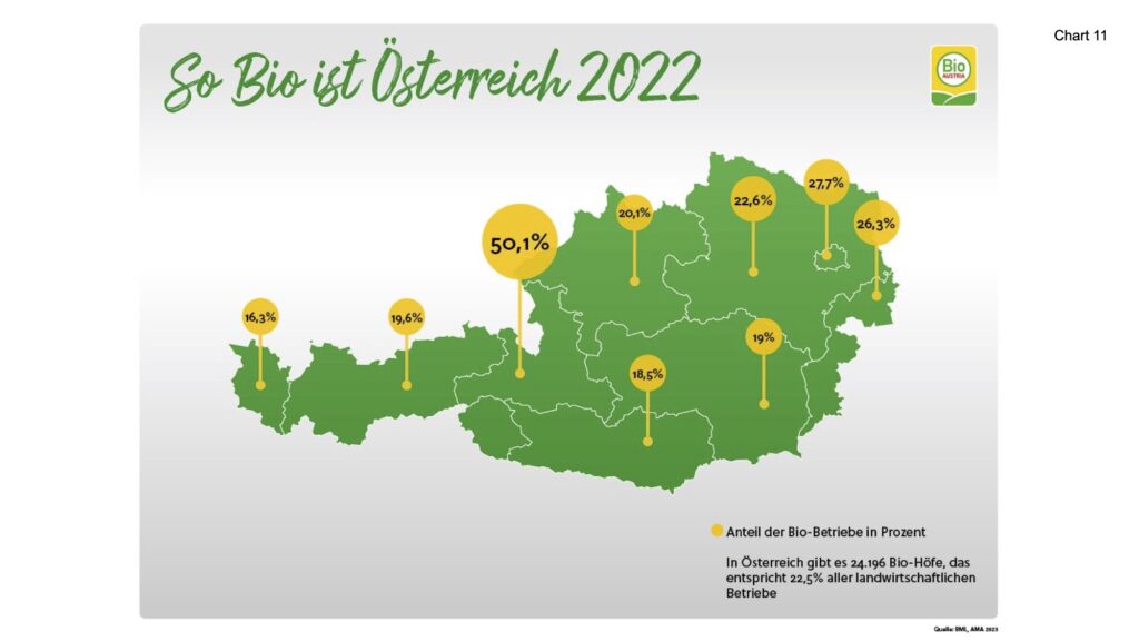Die Bio-Erfolgsgeschichte in Österreich lässt sich auch an den Produktionskennzahlen ablesen. Derzeit werden in Österreich 24.196 Höfe biologisch geführt, was einem Anteil von 22,5 Prozent aller landwirtschaftlichen Betriebe entspricht. Die Biobetriebe bewirtschaften insgesamt 688.809 Hektar Fläche, das sind knapp 27 Prozent der gesamten landwirtschaftlichen Fläche.
