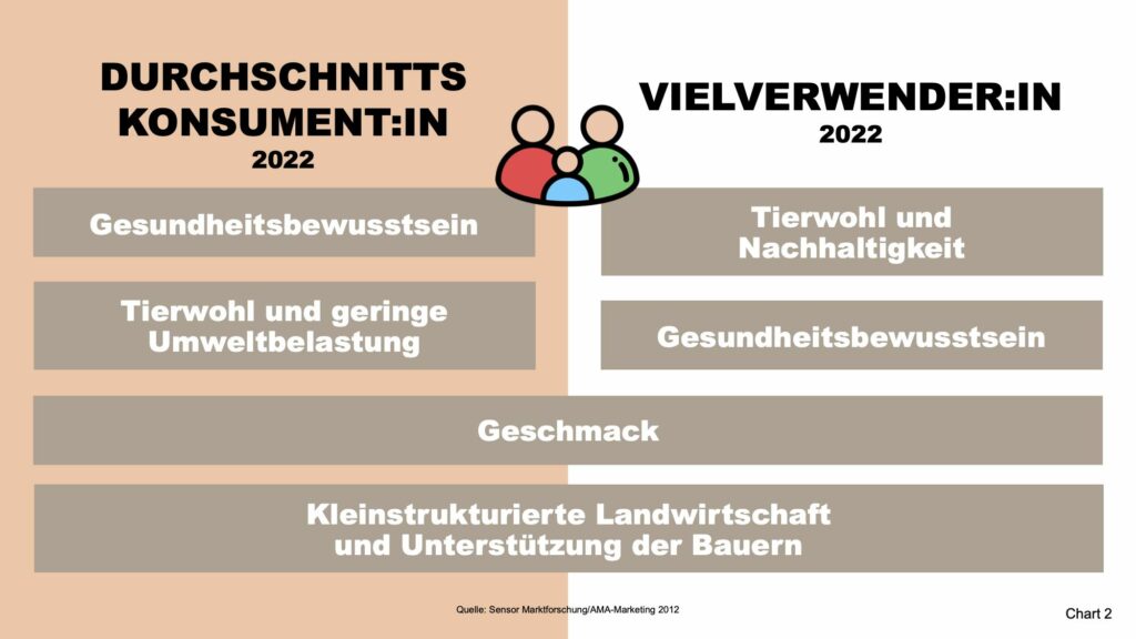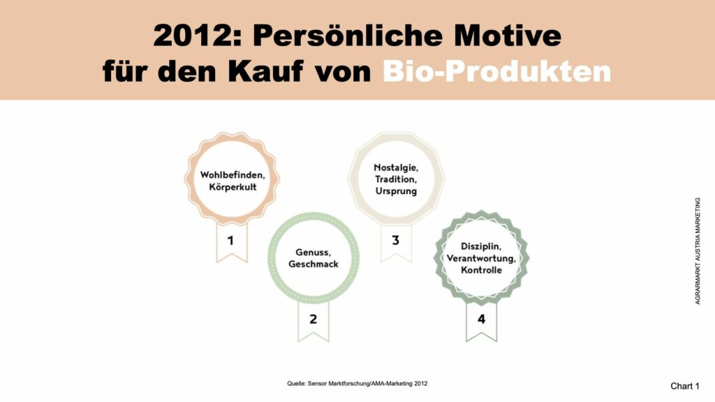Waren vor zehn Jahren die Motive für Bio-Einkäufe noch primär die Selbstfürsorge und der gute Geschmack , so greifen Konsument:innen heute stärker wegen Nachhaltigkeit, Klimaschutz, Umweltschutz und Tierwohl in das Bio-Regal. Bei jenen Konsumenten, die besonders viel Bio kaufen, sind die Aspekte der Nachhaltigkeit von Bio sogar an die erste Stelle der Bio-Motive gerückt.
