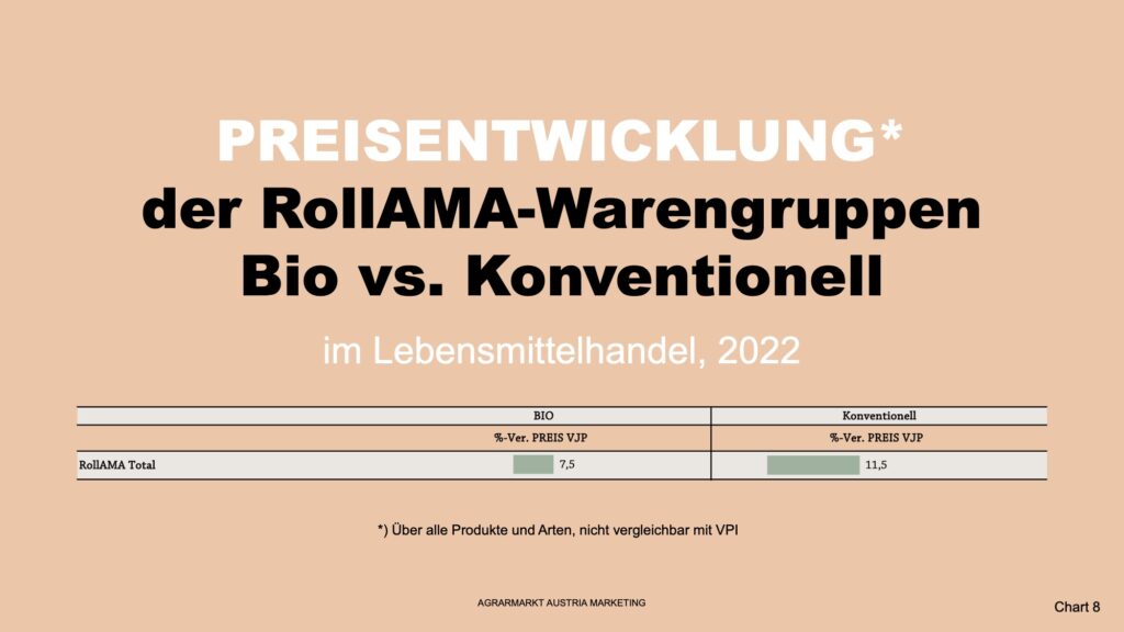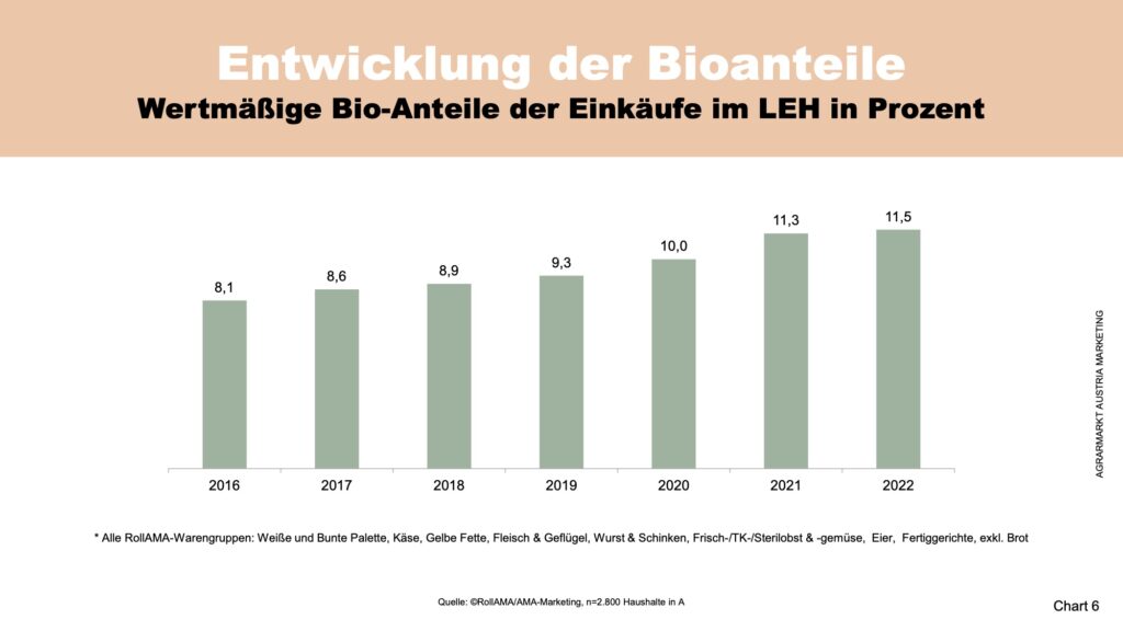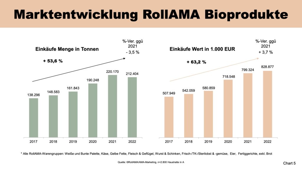 Dieser Trend lässt sich auch entsprechend durch Zahlen aus dem RollAMA-Haushaltspanel belegen. Die Umsätze mit Bio-Lebensmitteln im Lebensmitteleinzelhandel sind 2022 um 3,7 Prozent gestiegen, während die gekaufte Menge an Bio-Lebensmitteln um 3,5 Prozent gesunken ist. Der Grund für den Rückgang der Mengen liegt unter anderem im wieder häufigeren Außer-Haus-Konsum nach Ende der Lockdowns.