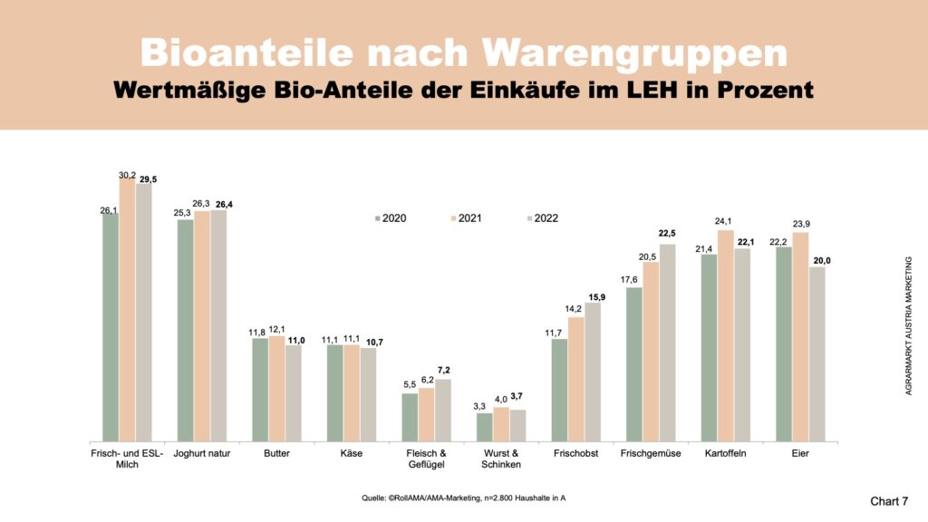 Innerhalb der einzelnen Warengruppen gibt es deutliche Unterschiede bei den Bio-Anteilen: Besonders hoch sind sie bei Trinkmilch (29,5 Prozent) und Joghurt natur (26,4 Prozent). Deutlich gestiegen sind die Bio-Anteile bei Fleisch und Geflügel (plus 1 Prozent), Frischobst (plus 1,7 Prozent) und Frischgemüse (plus 2 Prozent). Mit einem Bio-Anteil von 22,5 Prozent hat sich Frischgemüse 2022 zur drittstärksten Bio-Warengruppe katapultiert.