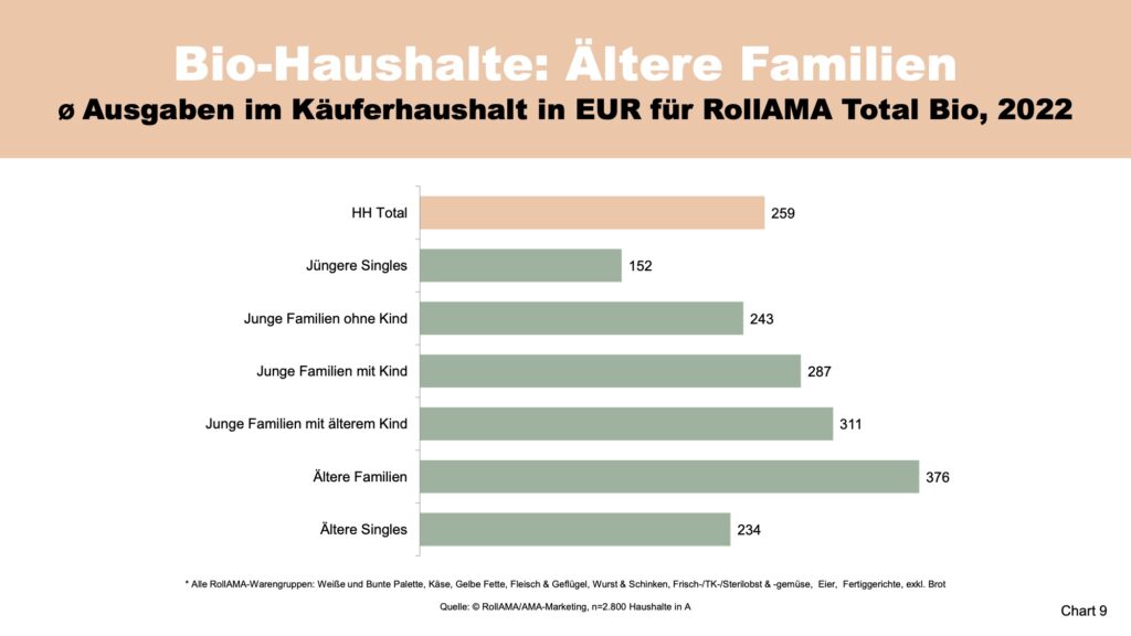Die Haushaltsausgaben für Bio-Lebensmitteln betragen durchschnittlich 259 Euro. Am stärksten ist Bio bei den „älteren Familien“ verankert, sie geben im Vergleich pro Jahr mit 376 Euro am meisten für Bio-Lebensmittel aus. Danach folgen junge Familien mit älteren und jüngeren Kindern, die pro Jahr 311 bzw. 287 Euro für Bio ausgeben.