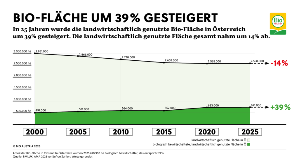 Strukturell steht Österreich im europäischen Vergleich weiterhin stark da. Rund 23 Prozent der landwirtschaftlichen Betriebe wirtschaften biologisch und bewirtschaften etwa 27 Prozent der Nutzfläche. Insgesamt entspricht das mehr als 23.500 Bio-Betrieben und knapp 691.000 Hektar Fläche.