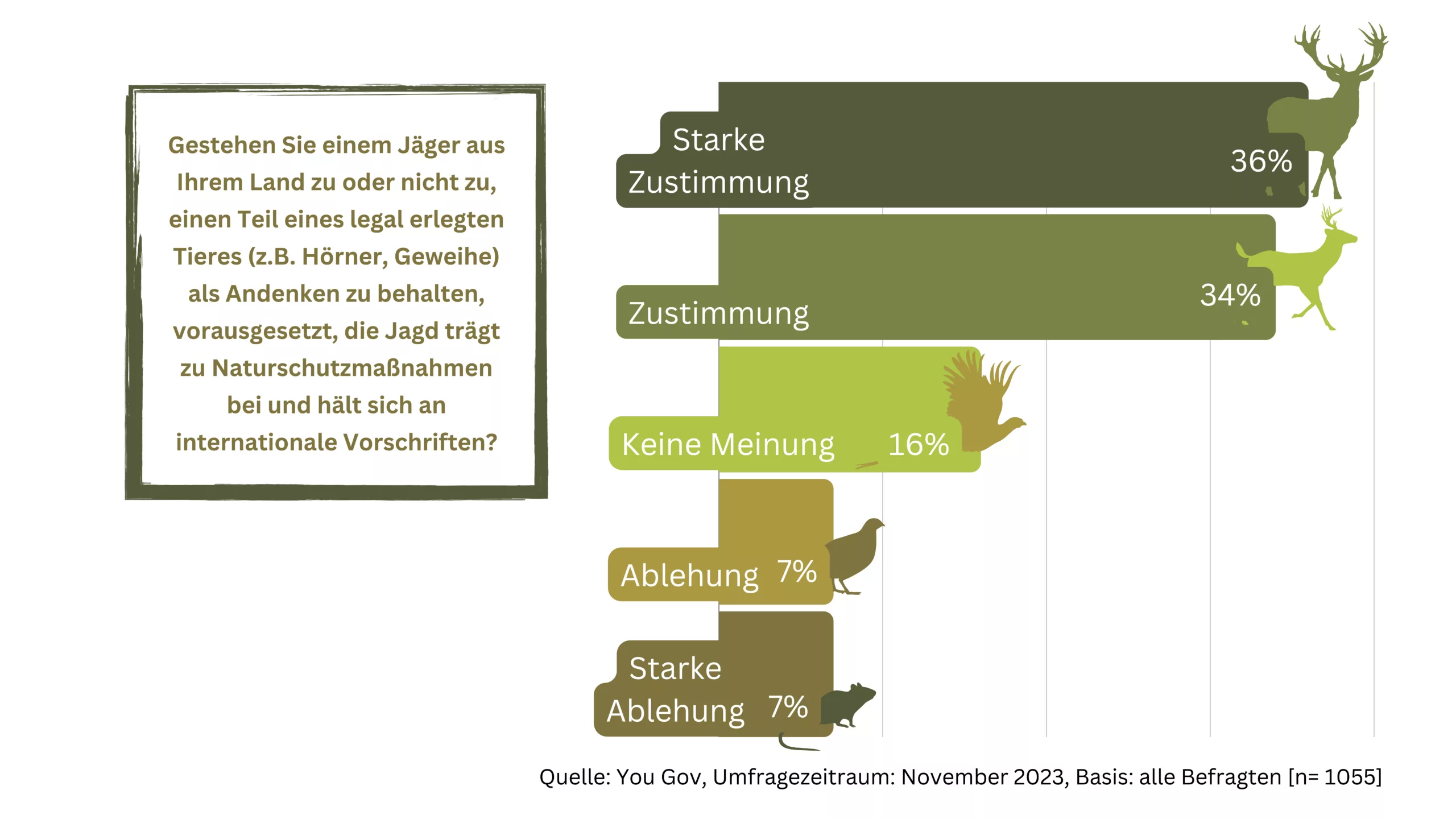 Eine von YouGov durchgeführte unabhängige Umfrage, basierend auf Antworten von mehr als 10.000 Teilnehmenden aus acht verschiedenen Ländern, zeigt auf, dass ein Großteil der europäischen Bevölkerung Jagd sowie Jägerinnen und Jäger positiv gegenübersteht. Dabei zeichnet sich Österreich mit einer Zustimmungsrate von über 70 Prozent als eines der Länder mit der höchsten Akzeptanz aus.