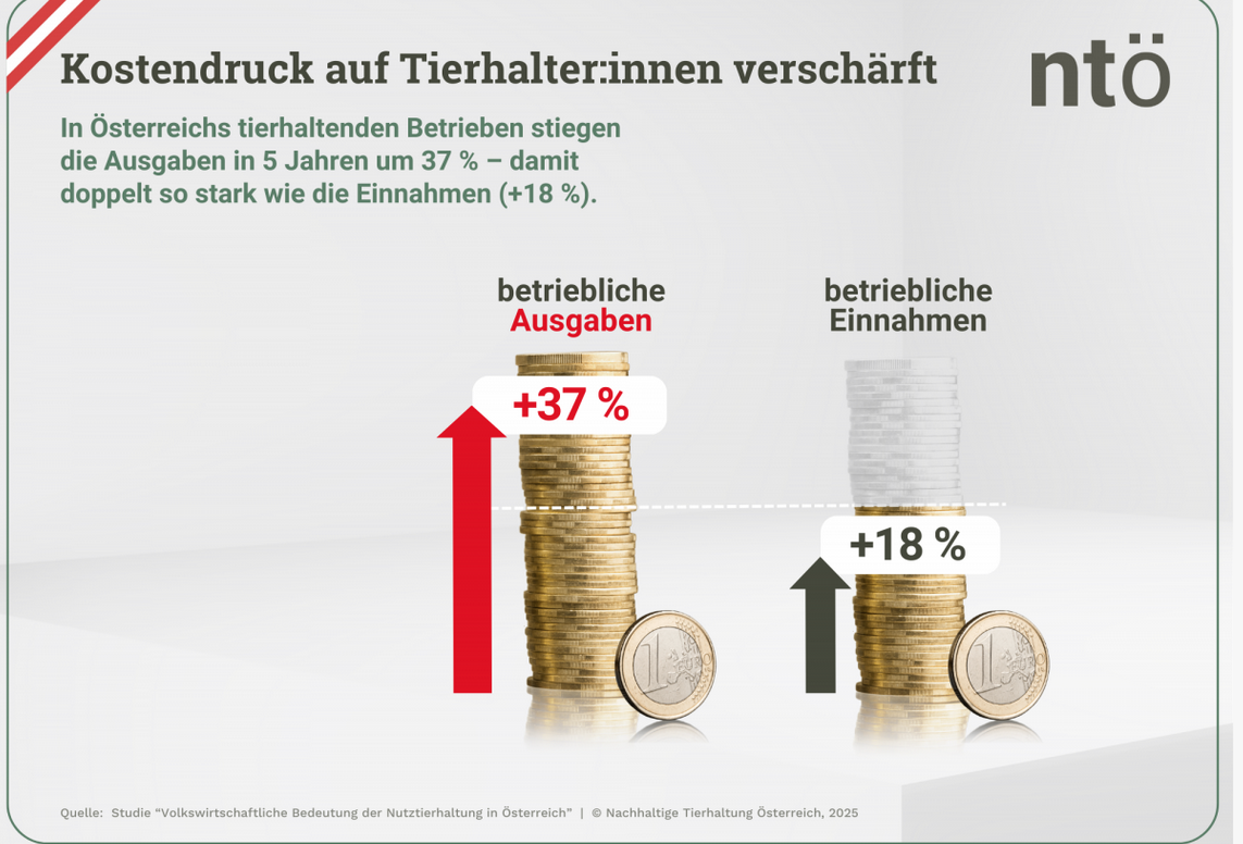 Im selben Zeitraum stiegen die Kosten über alle Tiersparten hinweg um durchschnittlich 36,6 Prozent. Futtermittel, Energie, tierärztliche Leistungen und Betriebsmittel belasten die Betriebe massiv. Die Folge: steigender wirtschaftlicher Druck trotz höherer Marktumsätze.