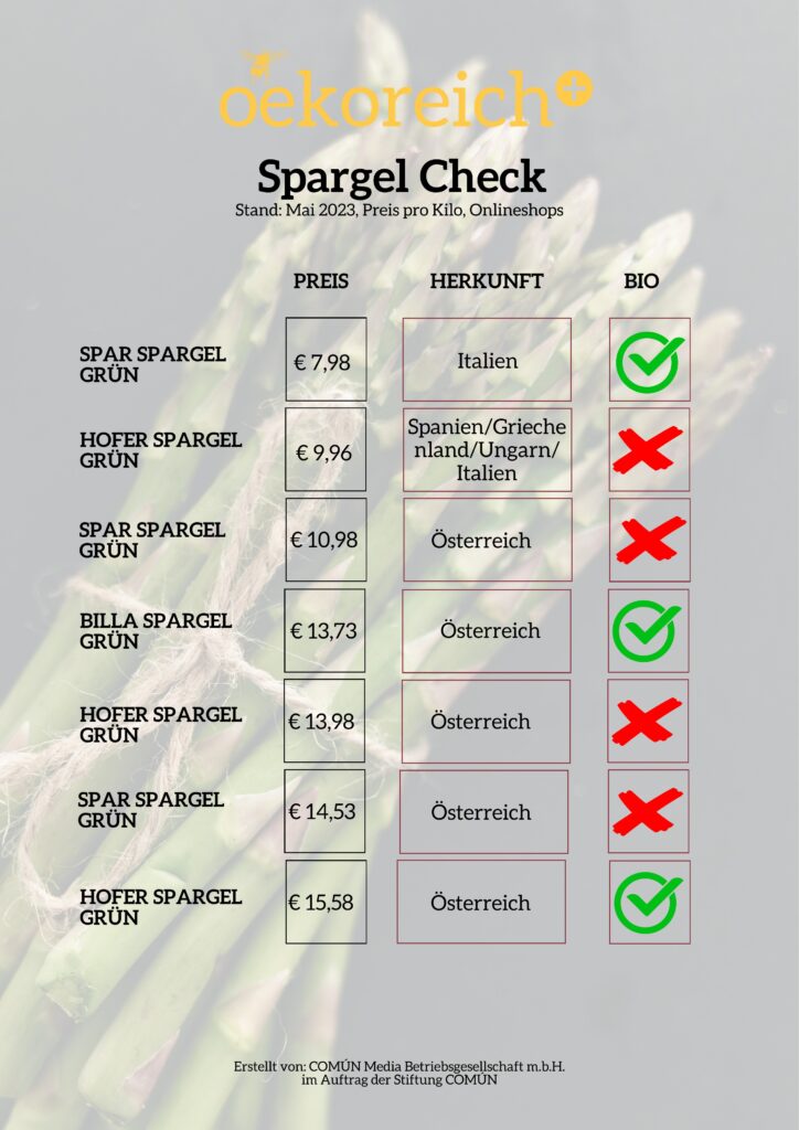 Die Initiative oekoreich hat 15 Spargel bei SPAR, BILLA & HOFER verglichen. Es zeigt sich, dass Herkunft, Preise & Qualität der Produkte stark abweichen. Am billigsten ist mit unter 8 Euro der grüne Import-Spargel aus Italien, beim weißen Spargel liegt das billigste Produkt bei unter 10 Euro und stammt aus Spanien/Italien.
