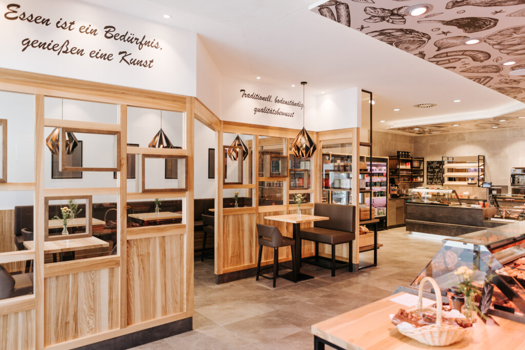 Da das Verkaufsgeschäft am Hauptstandort aus allen Nähten platzte, wurde gemeinsam mit dem Gastroprofi Wögerer ein zeitgemäßes Gesamtkonzept für den neuen Anbau entwickelt und umgesetzt. So entstand ein großzügiges, helles und freundliches Verkaufsgeschäft samt erweitertem kulinarischem Angebot und einladendem Imbissbereich. Die Kunden freuen sich über die riesige Auswahl in der großzügigen Verkaufsvitrine. Besonders ins Auge fällt die stirnseitig hinterleuchtete Deckengestaltung mit originellem Digitaldruck. In luftig ausgeführten Präsentationsregalen findet man zudem verschiedene Produkte des täglichen Lebens.