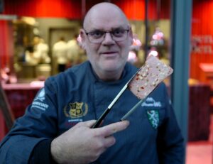 Dass sich Toni Krispel für den Auftritt als Familie entschieden hat, liegt an einem praktischen Grund: Die Würste sollen als eigenständige Bio-Kreation wahrgenommen werden und nicht unmittelbar mit ihrer „Konkurrenz“ an der Frischetheke verglichen werden. Denn der Leberkäse „Franz Wurscht“ im Glas unterscheidet sich nicht nur durch dieses Gebinde eben von herkömmlicher Aufschnittware fürs Semmerl. Auch die Packung mit vier Chorizos im starken Kaliber sind eine Alternative für alle, die im Delikatessenhandel bisher zu scharfen Debrezinern griffen. Aber sie schmecken eben auch deutlich anders als die härteren (und oft eindimensional paprikascharfen) spanischen Angebote im hiesigen Handel. Die Versorgung mit den neuen Spezialitäten, aber auch mit Klassikern wie dem Wollschwein-Karree übernahmen zwei Diplom Fleischsommeliers. Daniel Weißer, der Chefkoch des Genussguts, stand dabei mit Bernhard Steinhauer am Grill. „Nicht überall auf der Welt sucht man die Zartheit beim Schweinefleisch“, unternahm er einen Ausflug in die Zerlegungsmethodik spanischer Schweine. Da geht es vielmehr um gute Marmorierung der Cuts wie Presa (Nackenkern) oder Pluma (Federstück). Dass man diese ideal zubereiten kann, demonstrierte der Leiter der „Steirischen Grillschule“ den Gästen. Vor allem die Pluma mundete noch heiß vom Designgrill von Martin Krainer, der aus Corten- und Edelstahl gefertigt wurde.