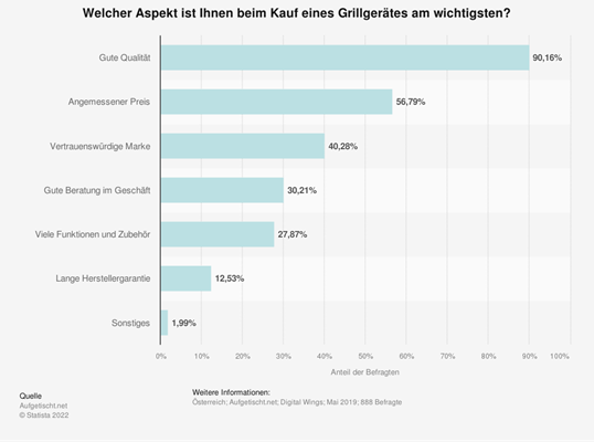Eine gute Qualität und ein angemessener Preis sind den Befragten beim Kauf eines Grillgeräts am wichtigsten. (©Statista2022)