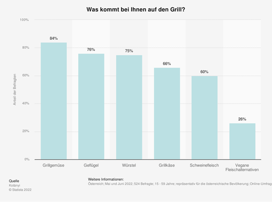 Grillgemüse liegt auf Platz 1, gefolgt von Geflügel und Würstel. (©Statista 2022)